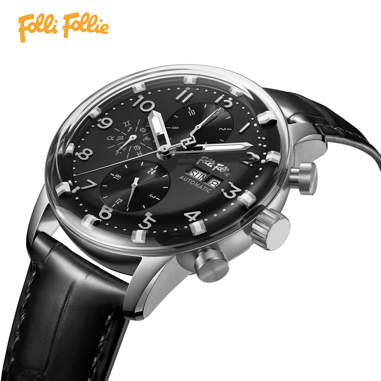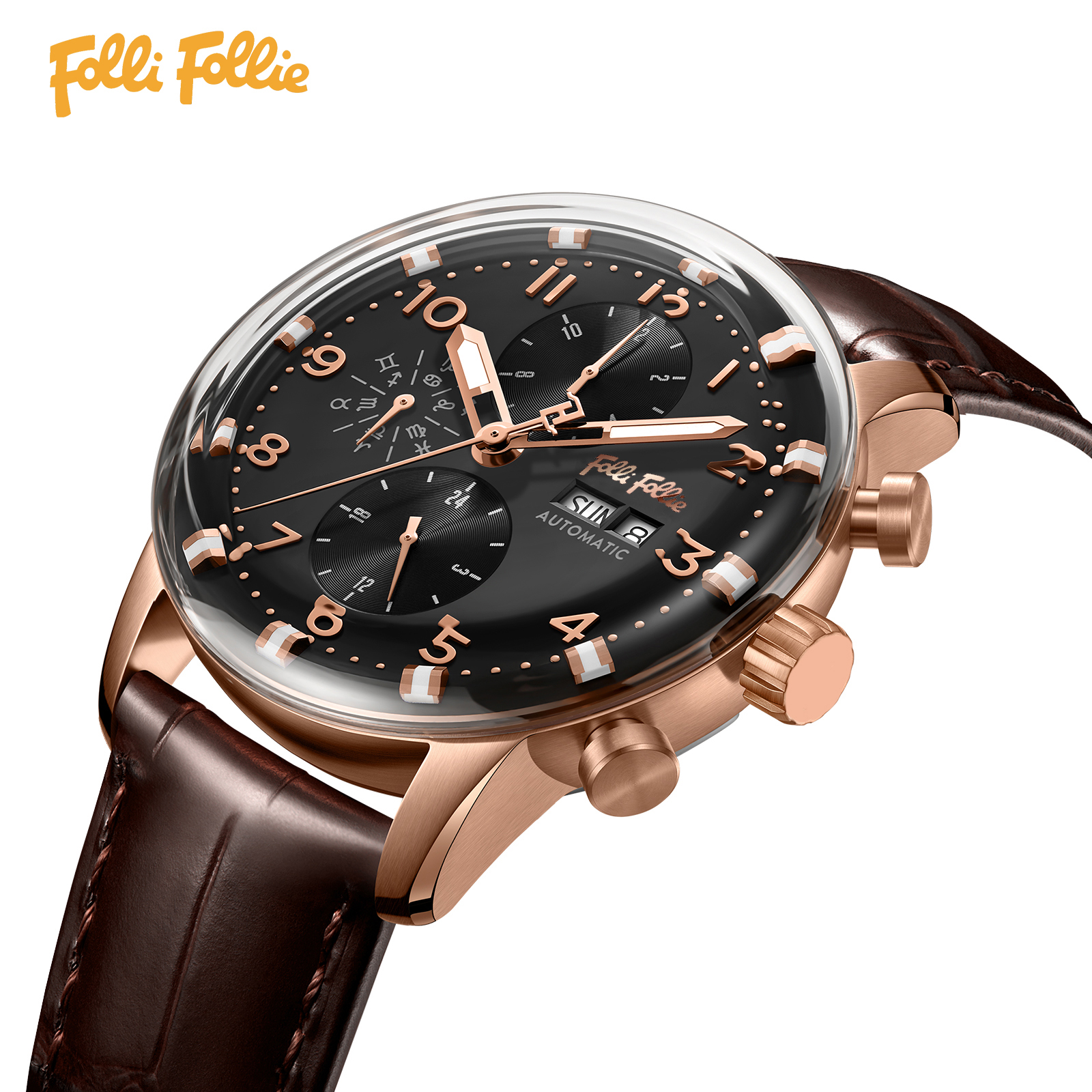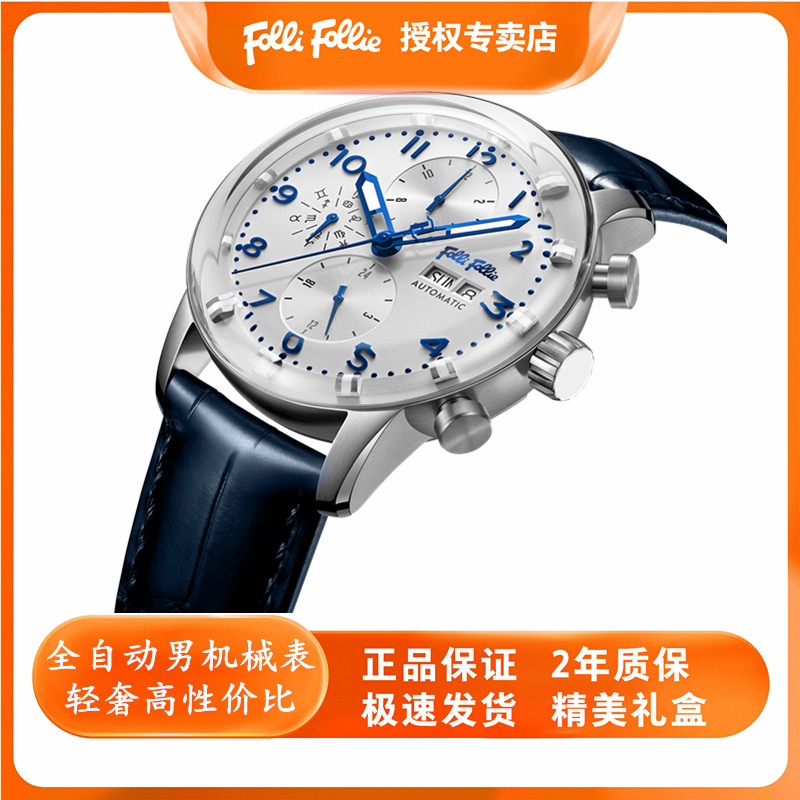 follifollie全自动机械手表商务休闲牛皮深度防水男士复古腕表潮