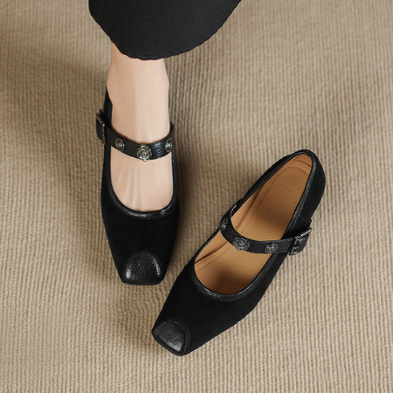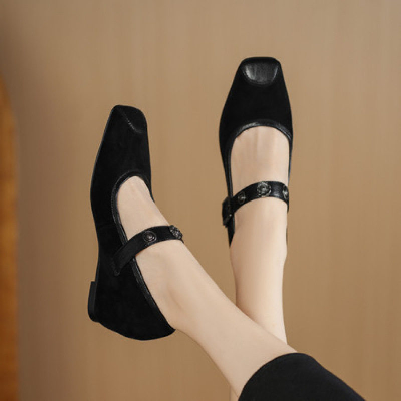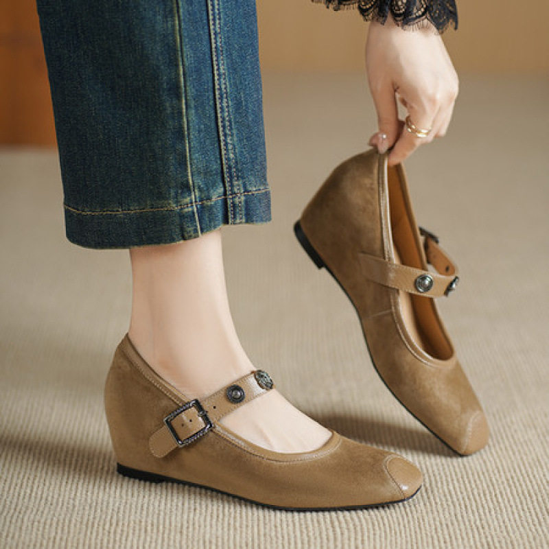 法式复古磨砂内增高浅口单鞋女通勤真皮方头小皮鞋一字带坡跟女鞋