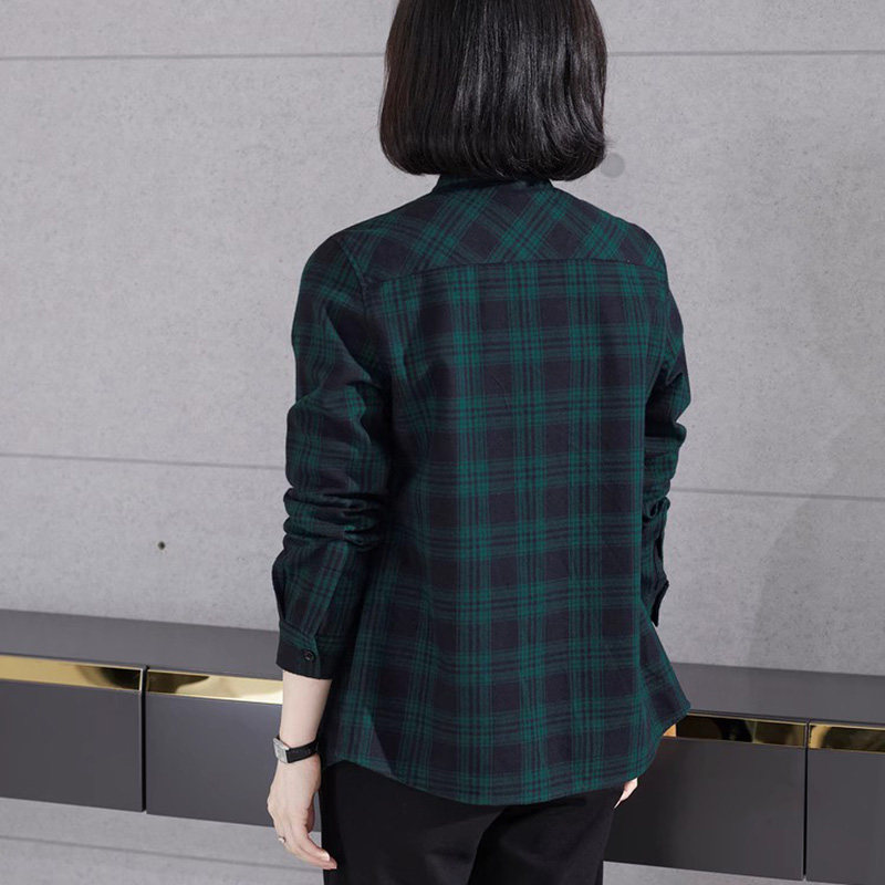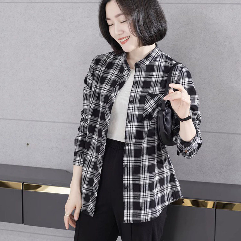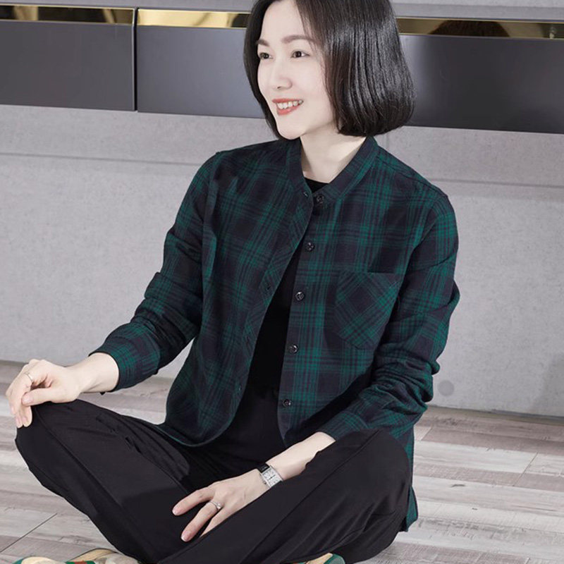纯棉绿色黑白格子衬衫女款春秋新款大码宽松长袖上衣洋气立领小衫