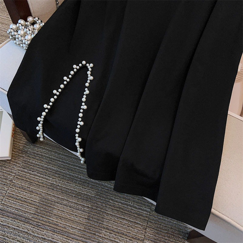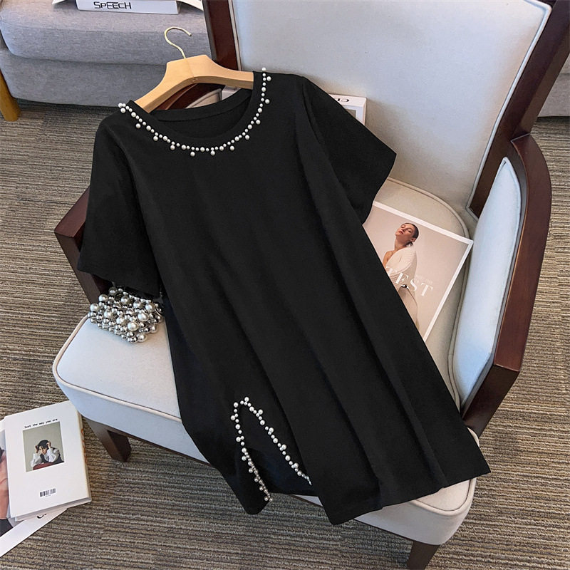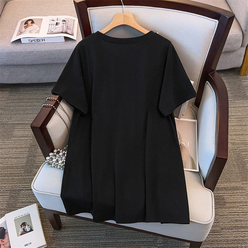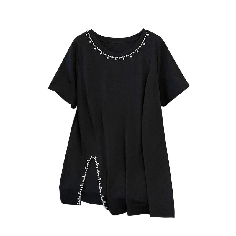300斤特大码法式钉珠短袖T恤女夏胖mm350宽松遮肚中长款开叉上衣