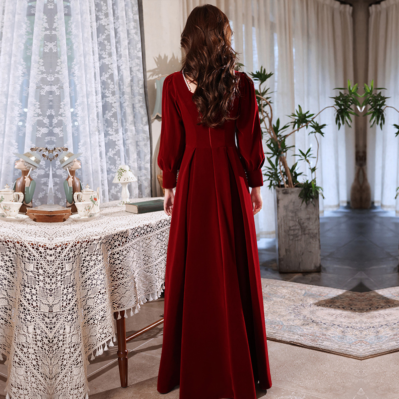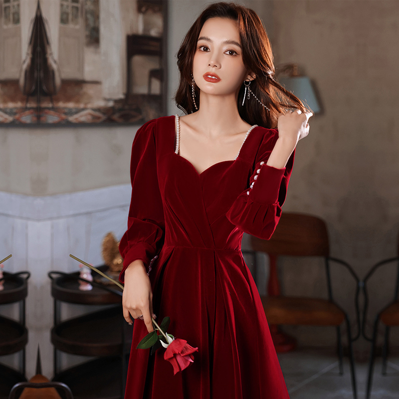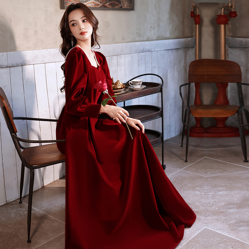 礼服轻奢小众高端聚会宴会方领新娘酒红色婚礼长款回门服平时可穿