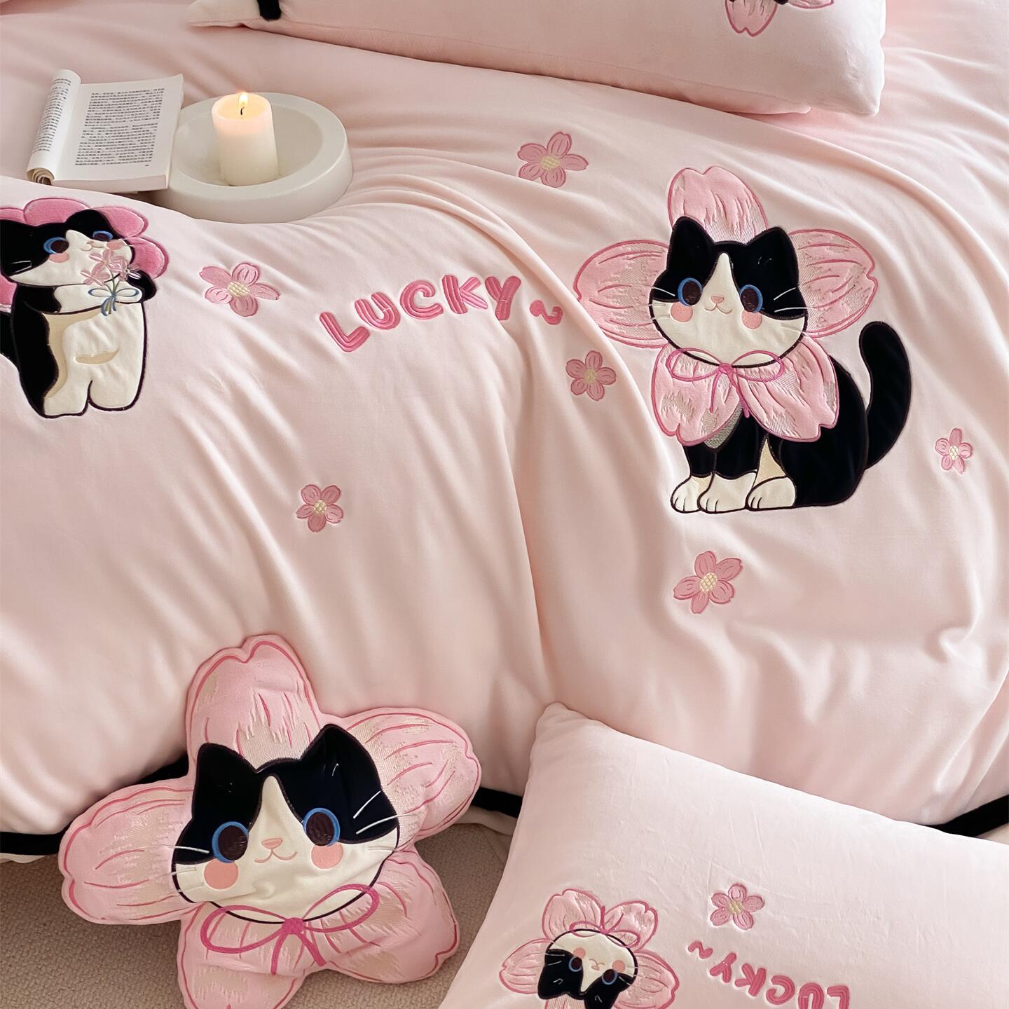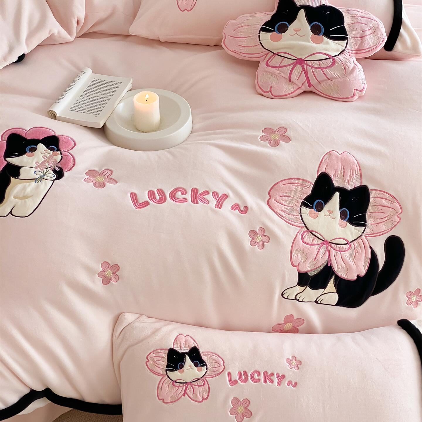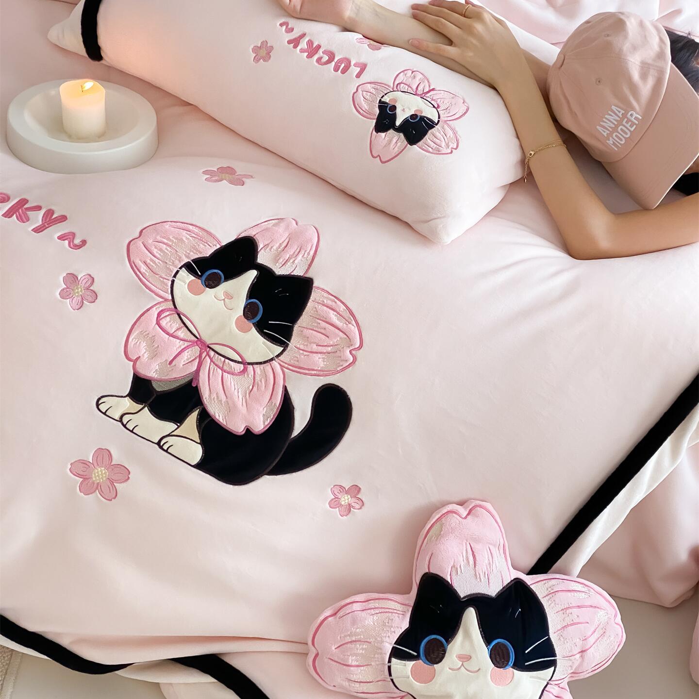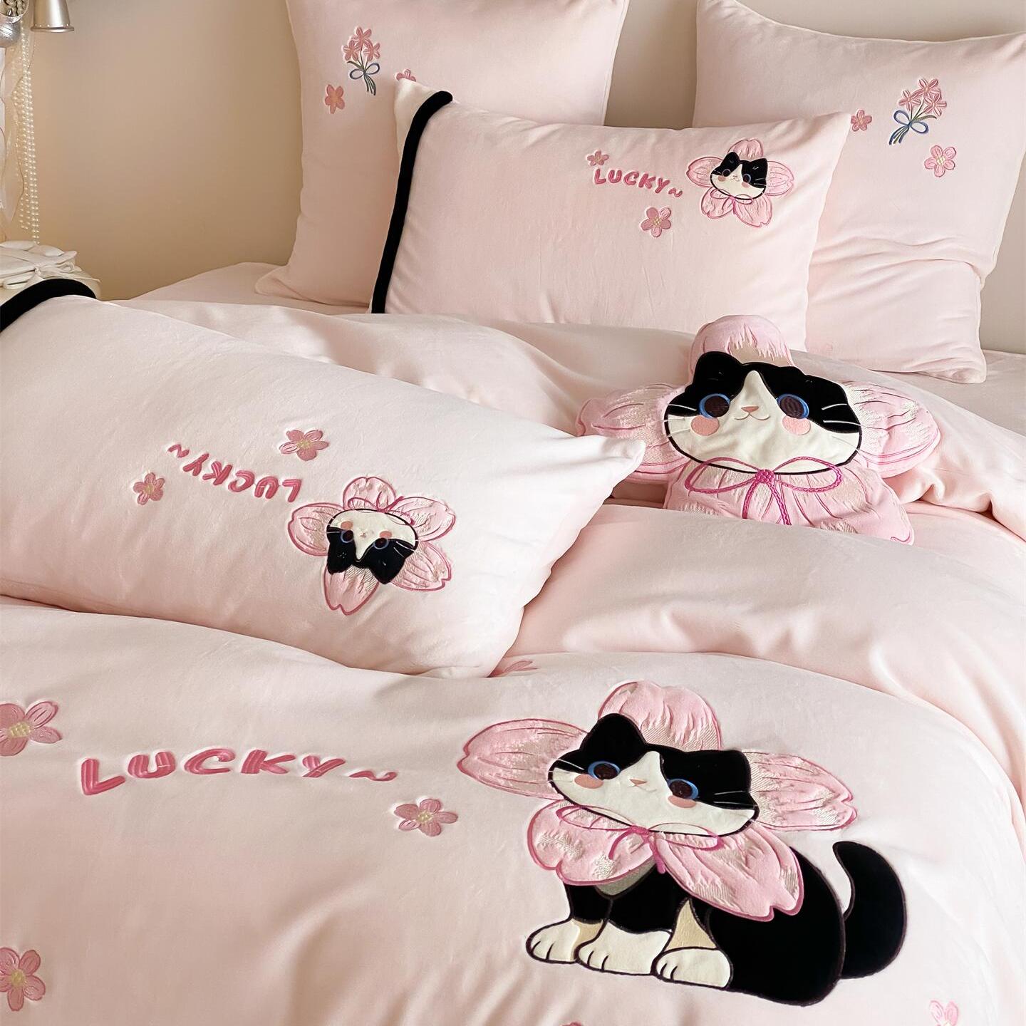 桃花猫|秋冬季加厚刺绣牛奶绒四件套 卡通公主风珊瑚绒被套床单款
