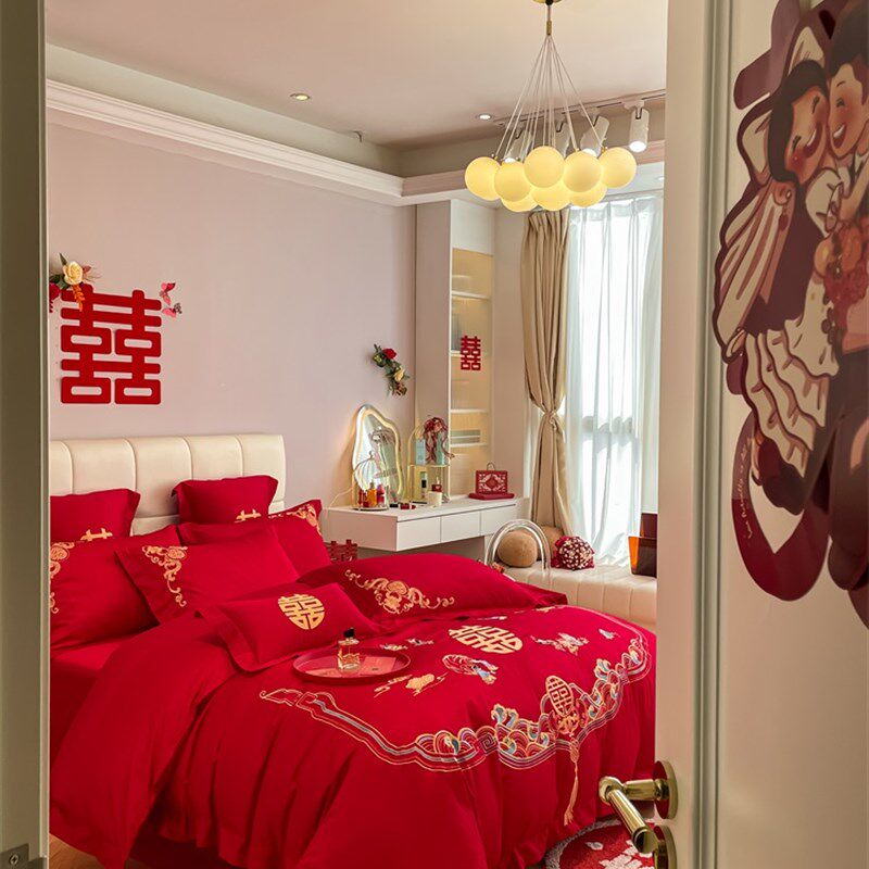 中式百子图刺绣结婚四件套红色床单被套喜被婚庆床上用品