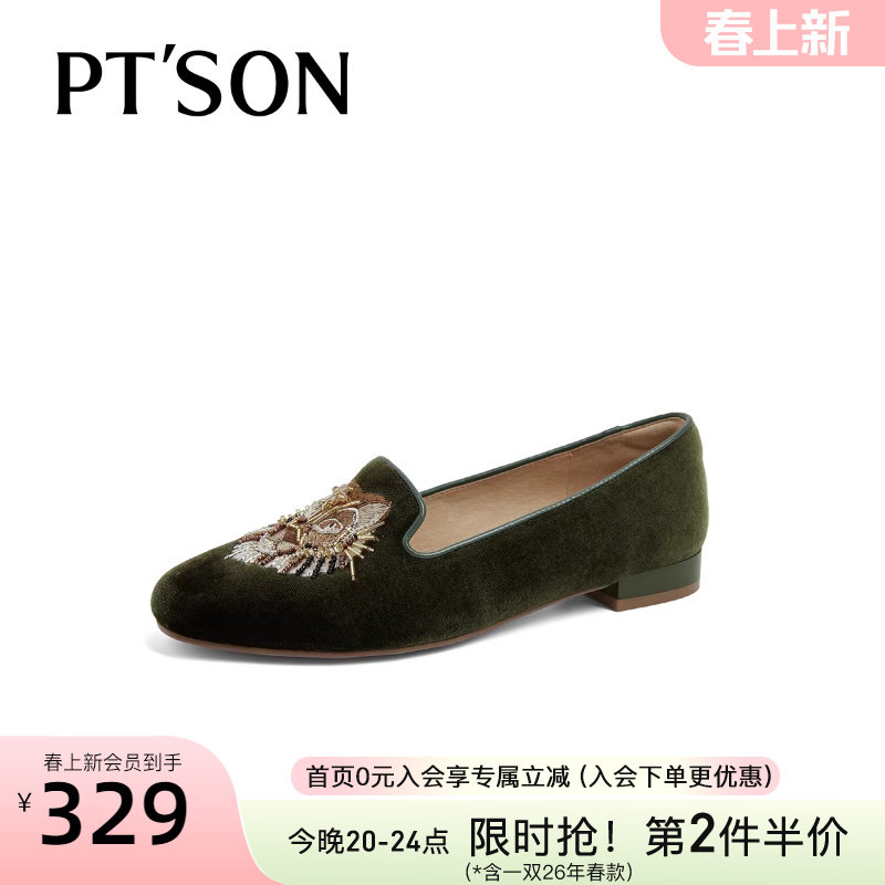 商场同款百田森国风刺绣中式单鞋女年新款乐福鞋绒面平底鞋子