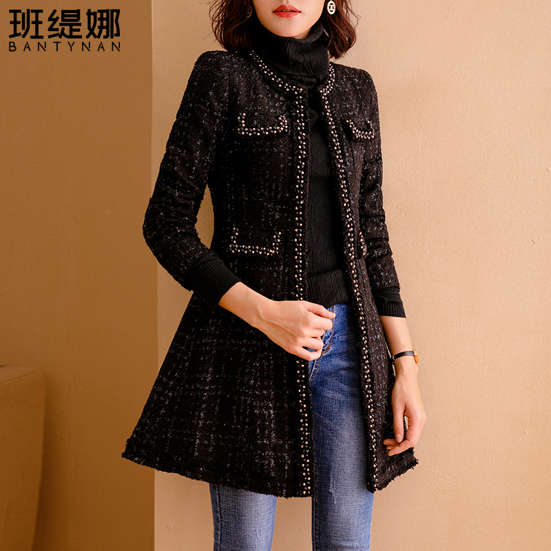 毛呢大衣女名媛秋冬2024新款黑色中长款修身高端粗花呢小香风外套