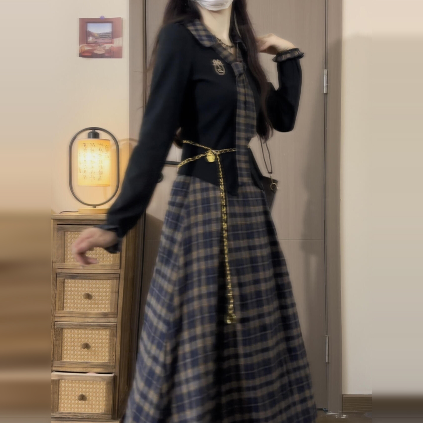 韩系学院风黑色长袖格纹连衣裙子女2025新款早秋穿搭一整套装长裙