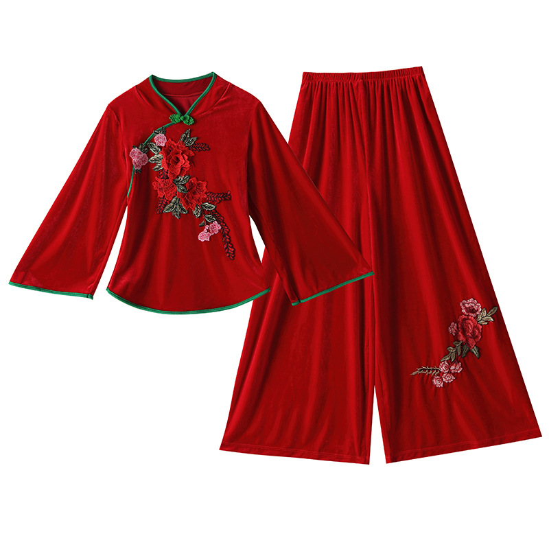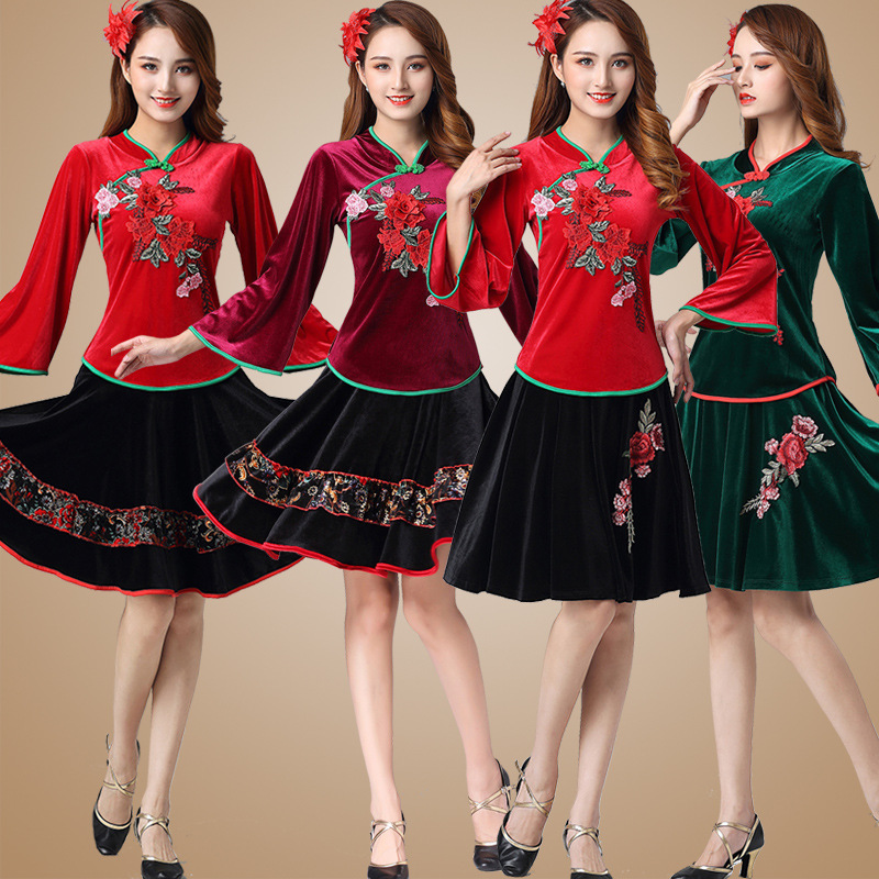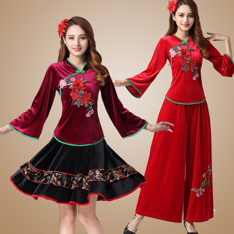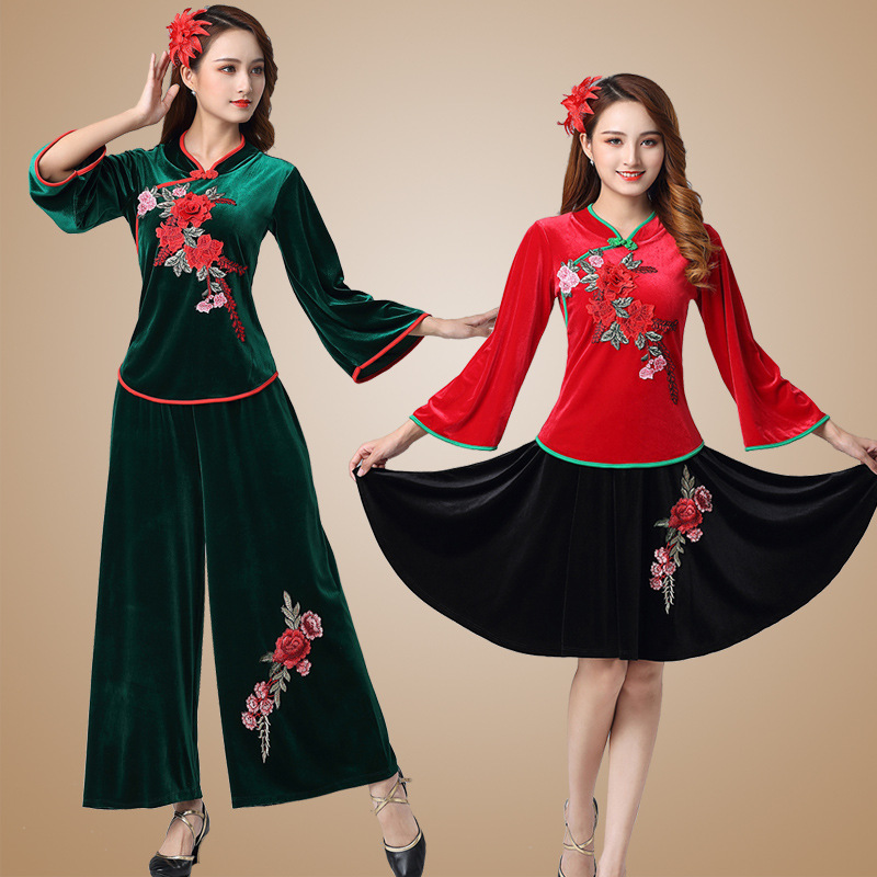 日本品质2020秋冬新款广场舞服装金丝绒套装中老年民族风秧歌扇子