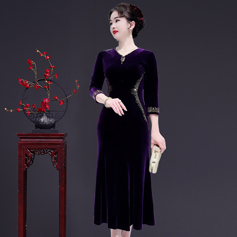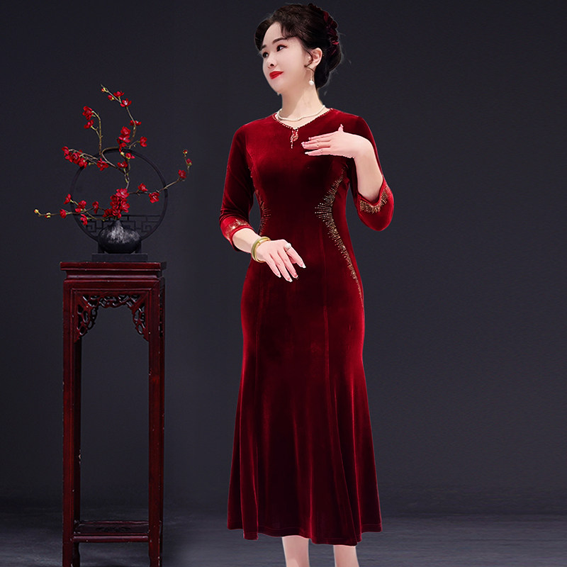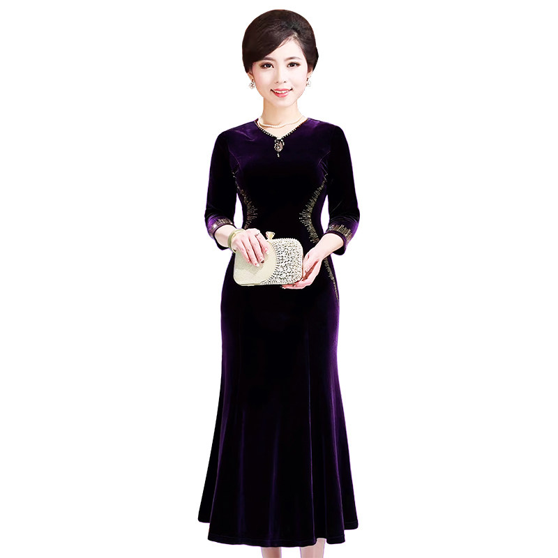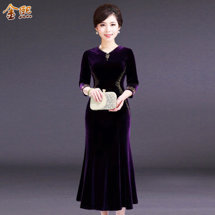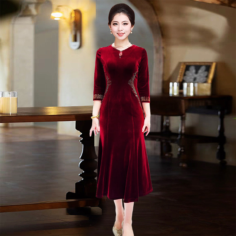 高贵中年女装春秋季连衣裙喜婆婆鱼尾裙礼服中长款大码婚礼妈妈装
