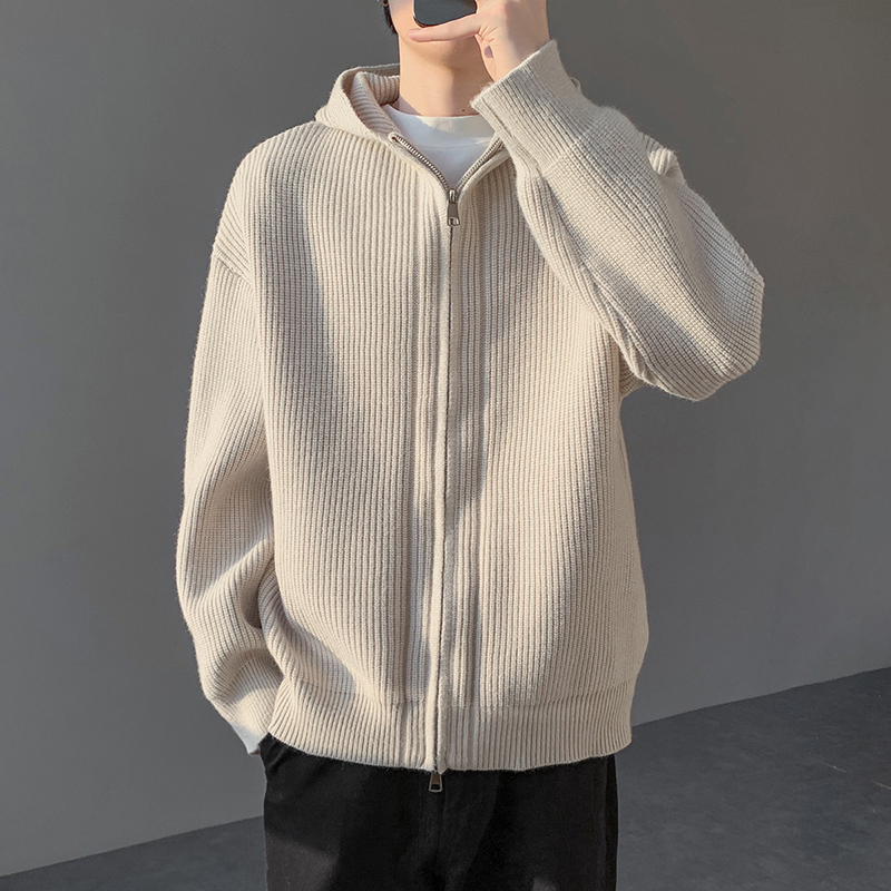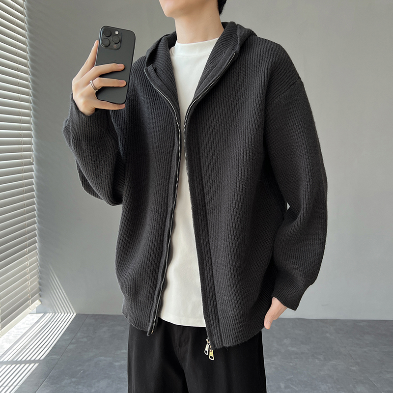 FOFWMODE秋冬季纯色坑条连帽开衫毛衣男宽松情侣简约百搭针织帽衫