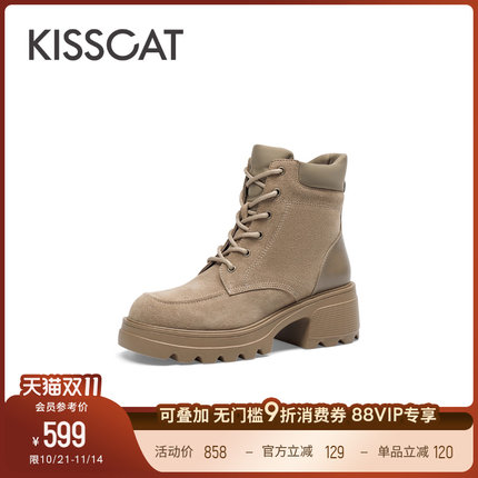 KISSCAT接吻猫新款真皮短靴系带大黄靴增高厚底马丁靴女英伦风