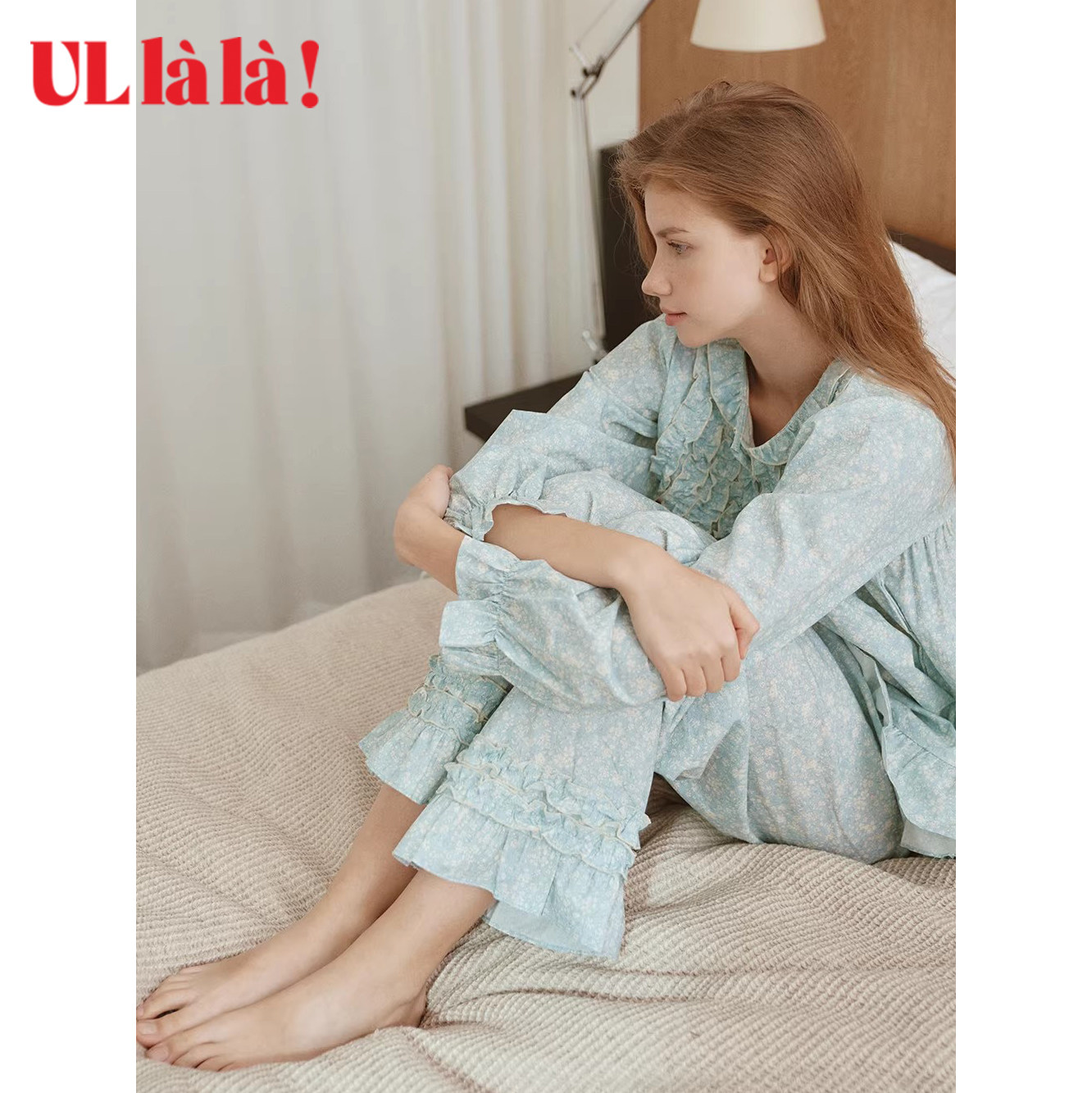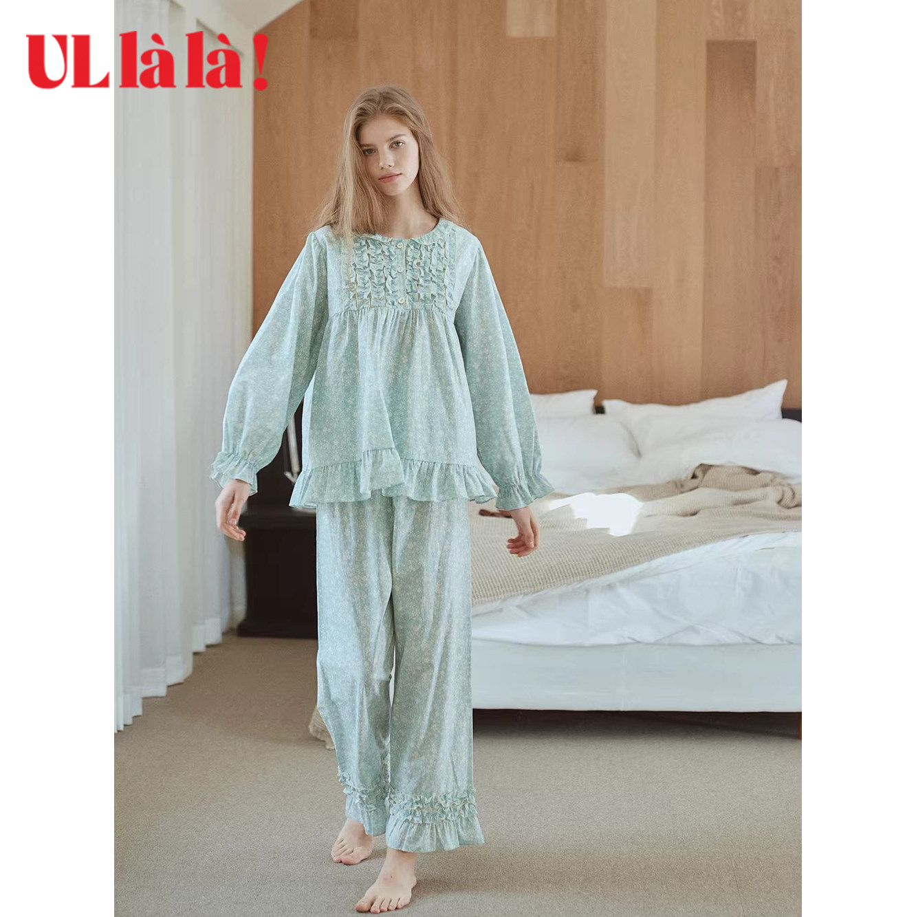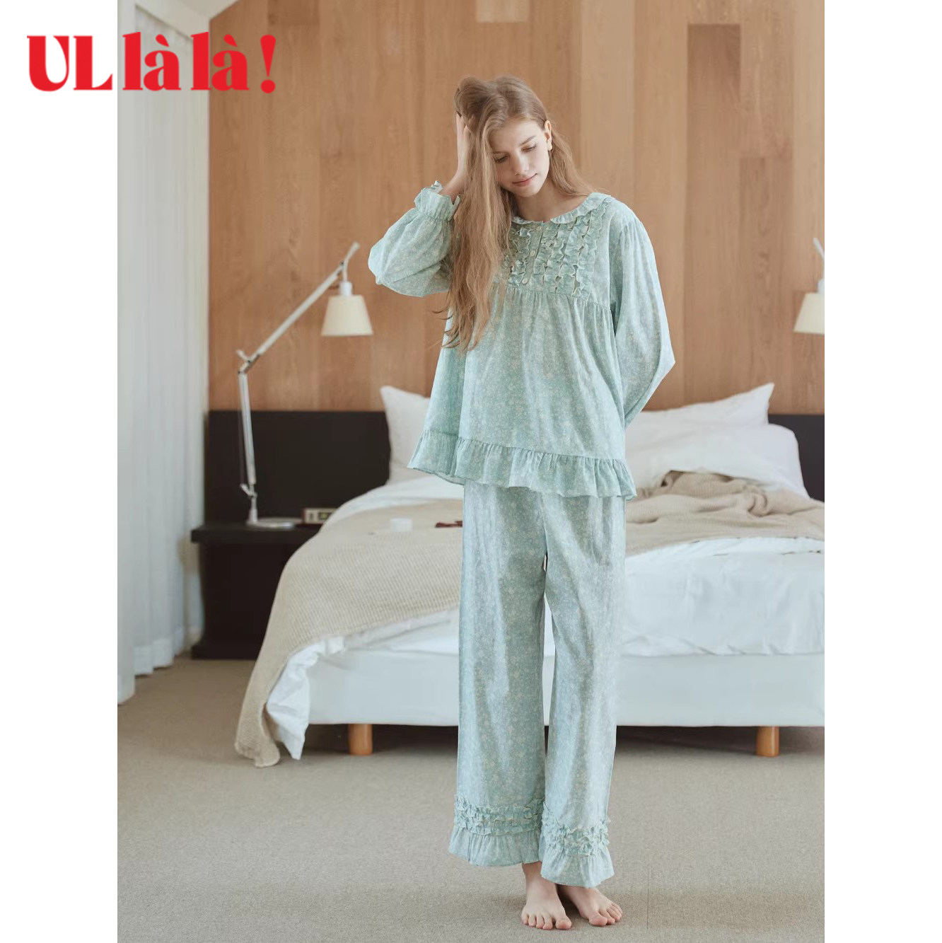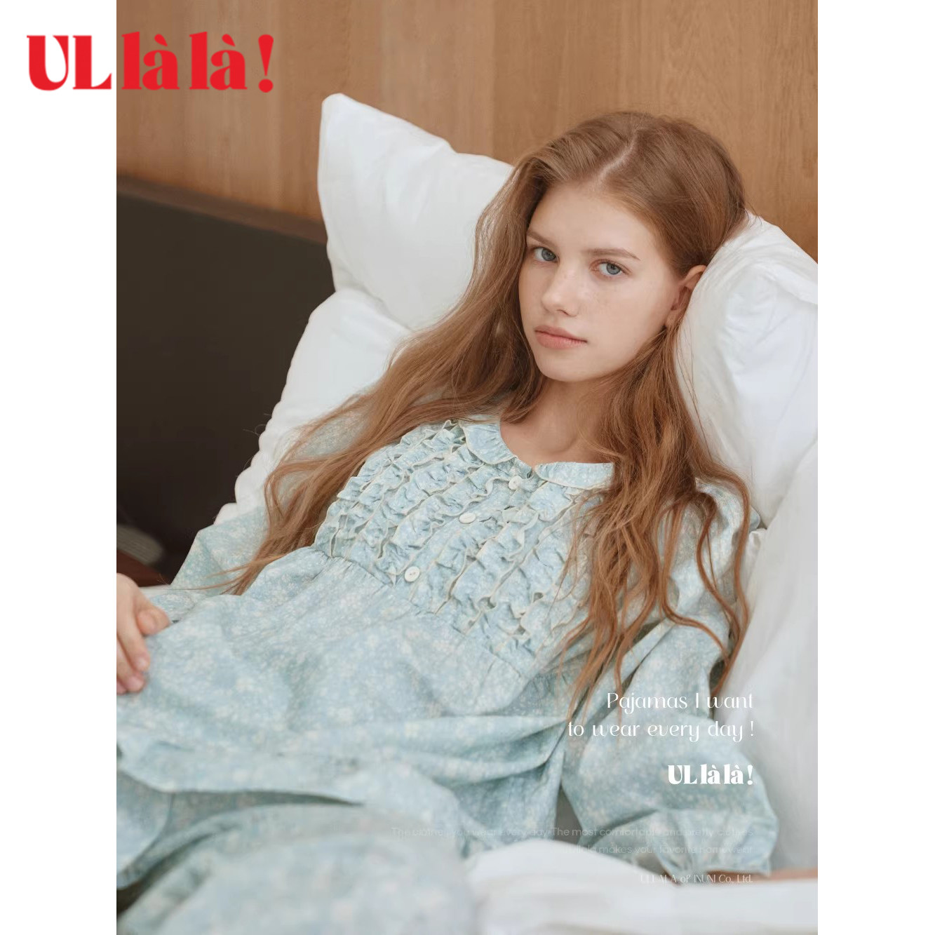 Ullala韩国进口甜美花边纯棉娃娃领长袖清新睡衣女春夏家居服套装