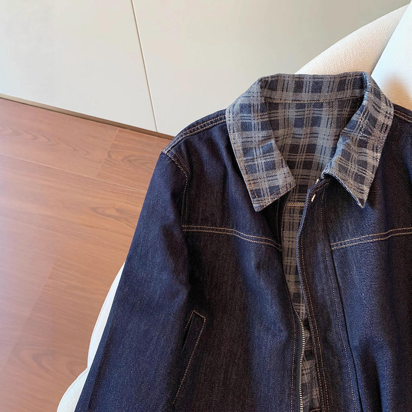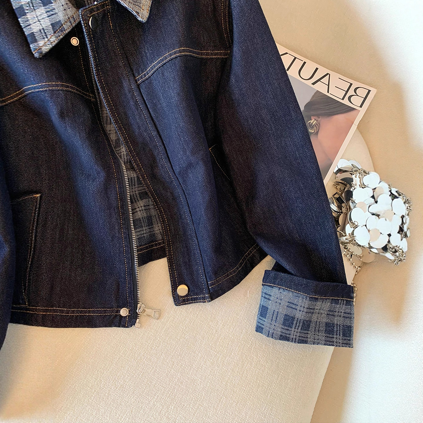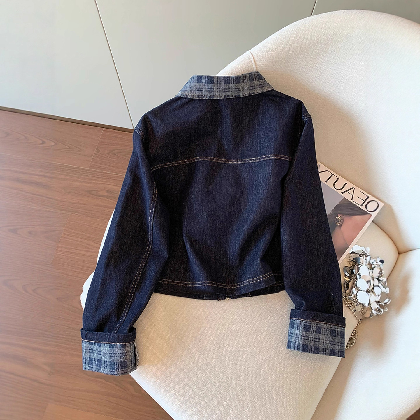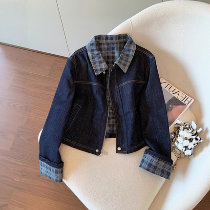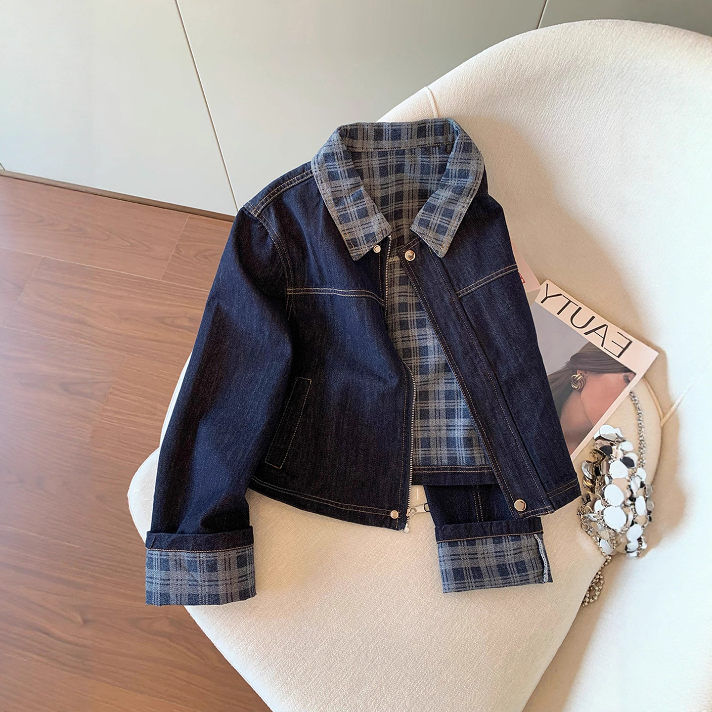 韩系水洗复古格纹翻领牛仔外套女秋季宽松开衫小个子短款休闲上衣
