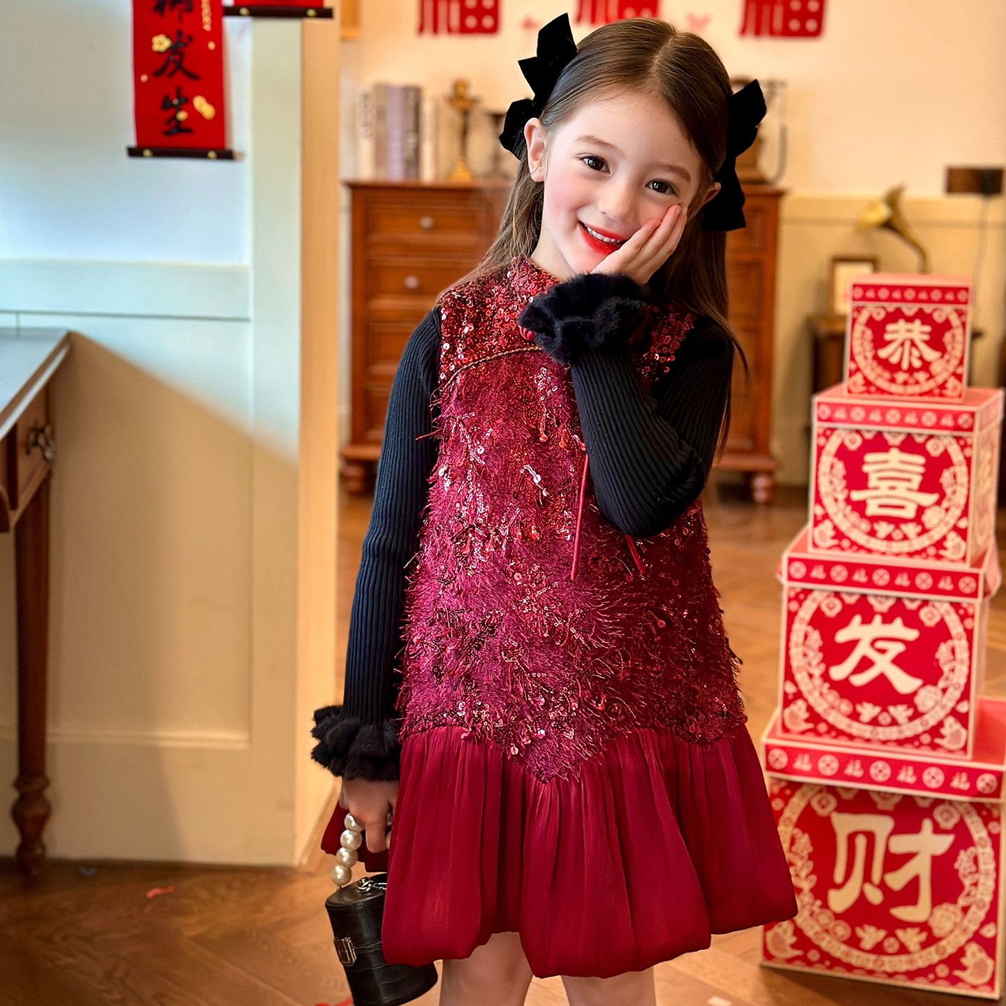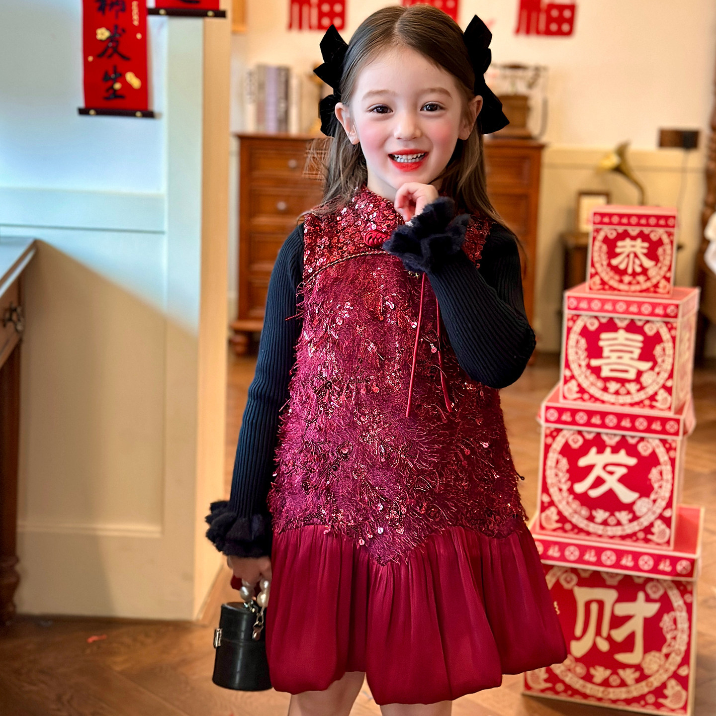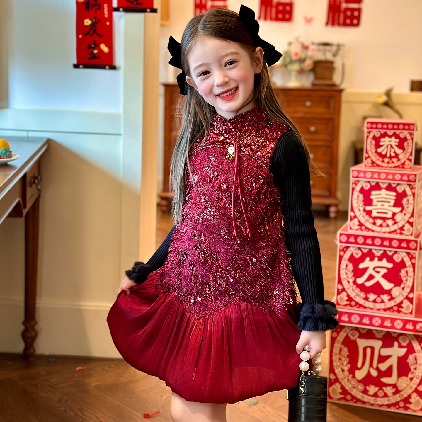 栀了成长记童装女童新中式红色背心裙2026春秋儿童国风加绒连衣裙