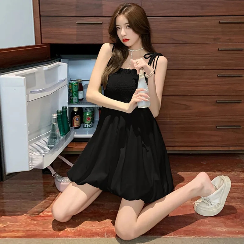纯欲风吊带抹胸连衣裙夏季2025新款收腰显瘦气质小黑裙蓬蓬花苞裙