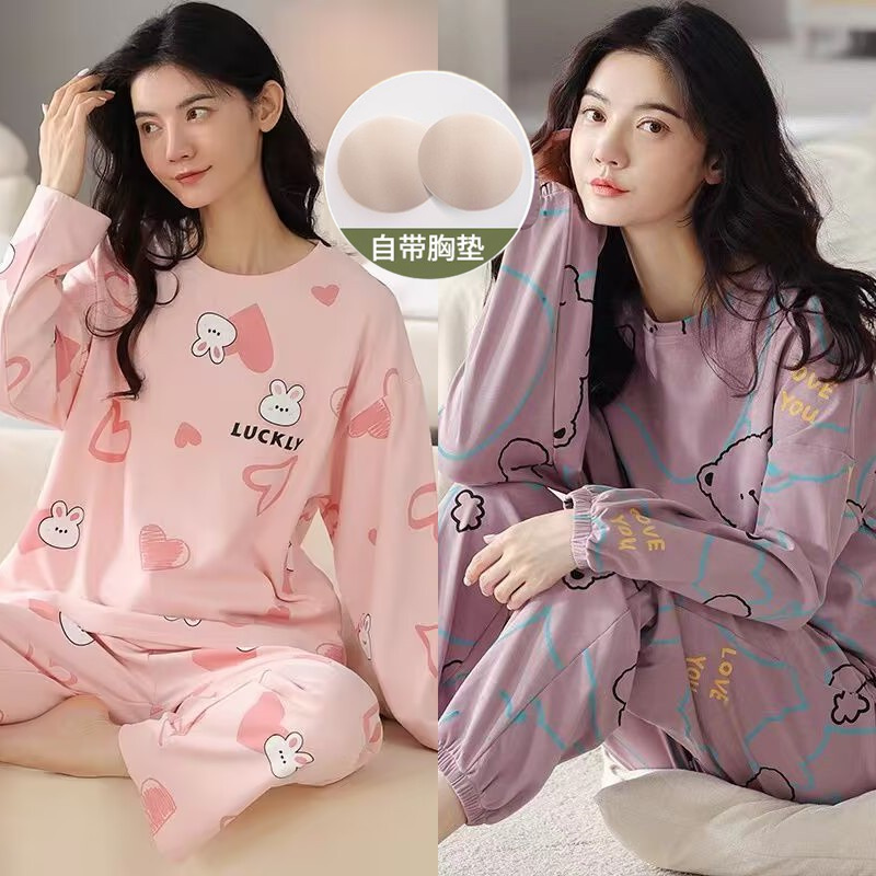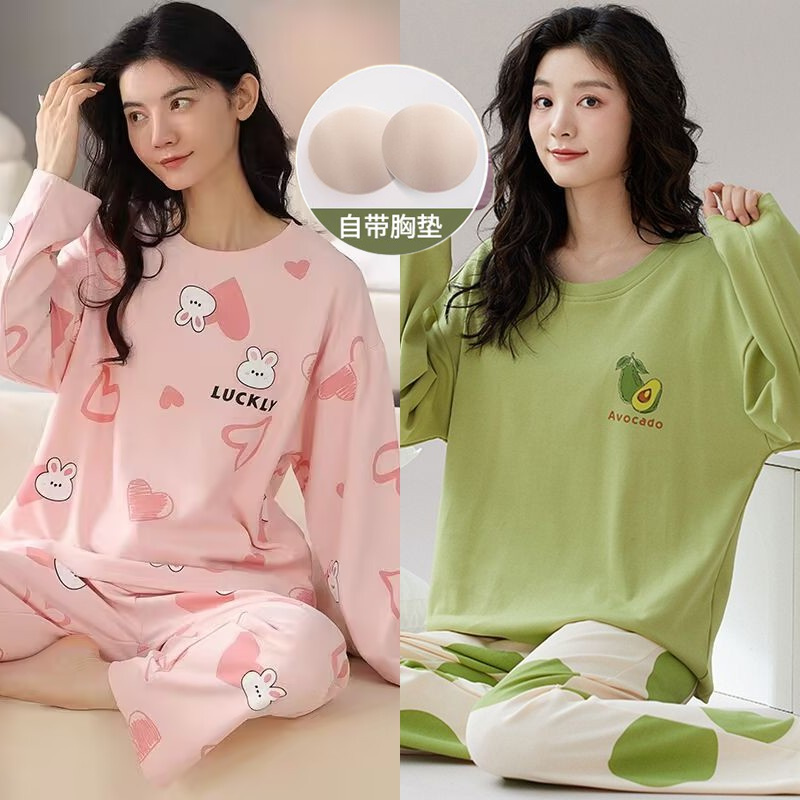 睡衣女春秋款带胸垫2025新款纯棉秋冬宽松大码长袖家居服长裤套装