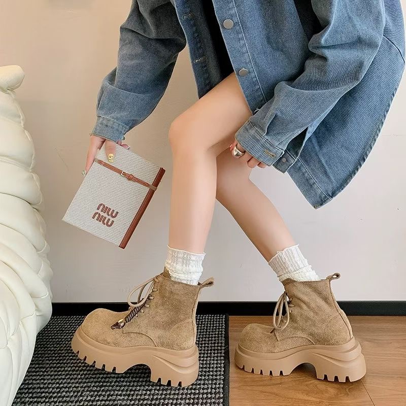 2025秋款大黄蜂高跟百搭厚底小个子增高女短靴圆头复古系带马丁靴