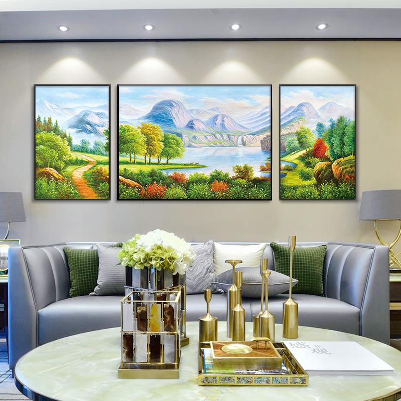 青山绿水山水画客厅挂画沙发背景墙三联画纯手绘油画日照金山壁画