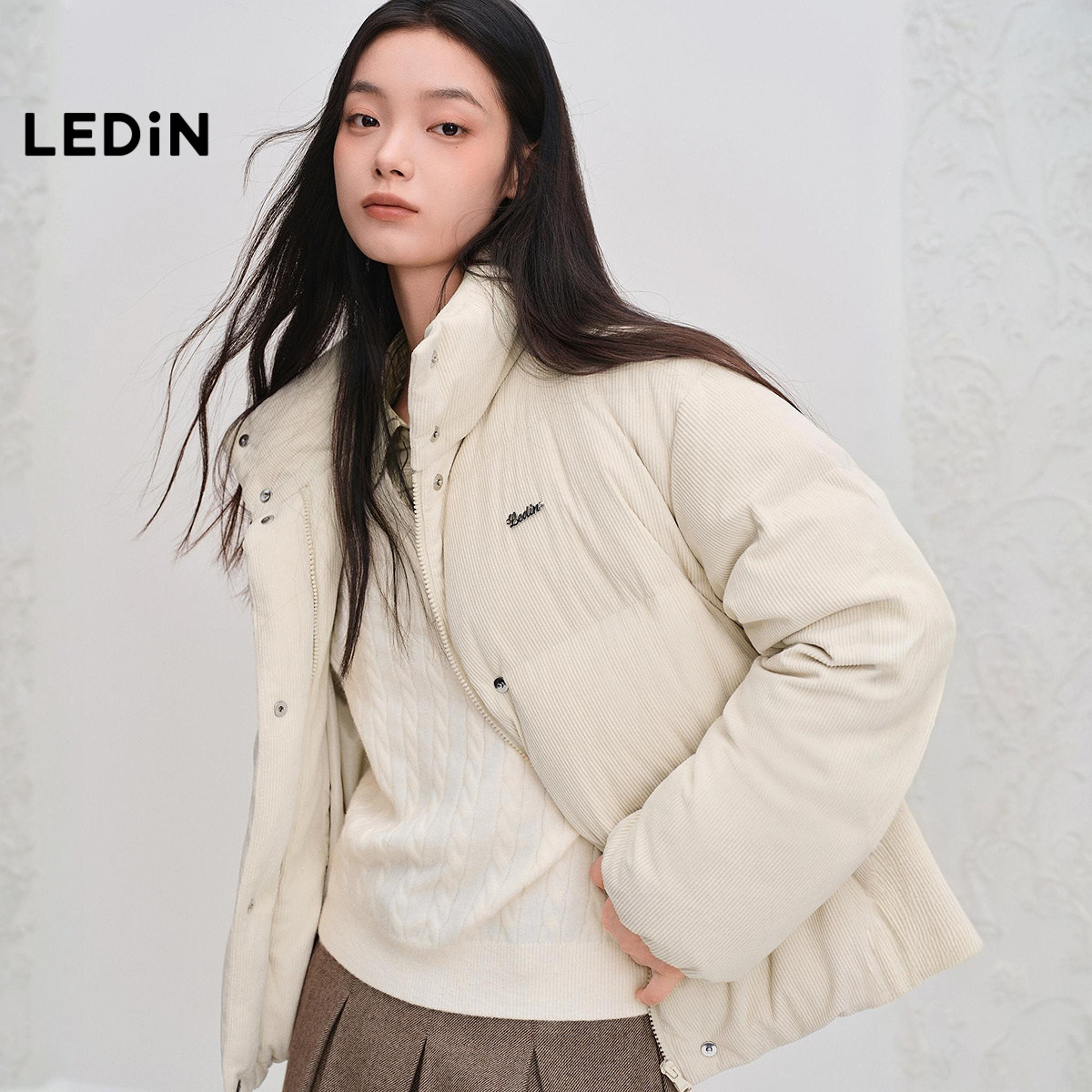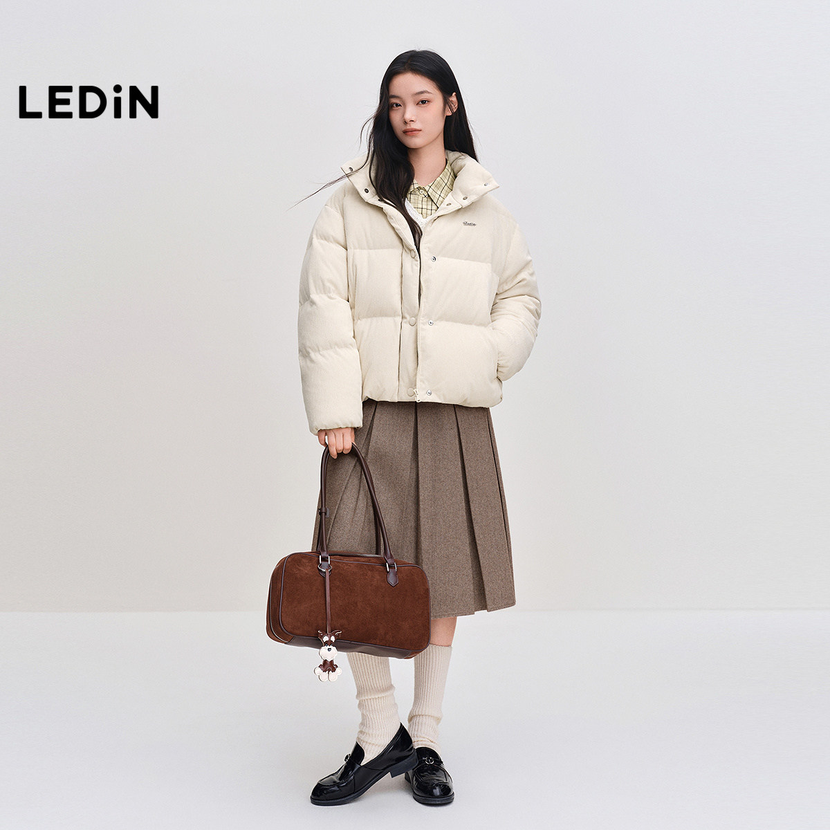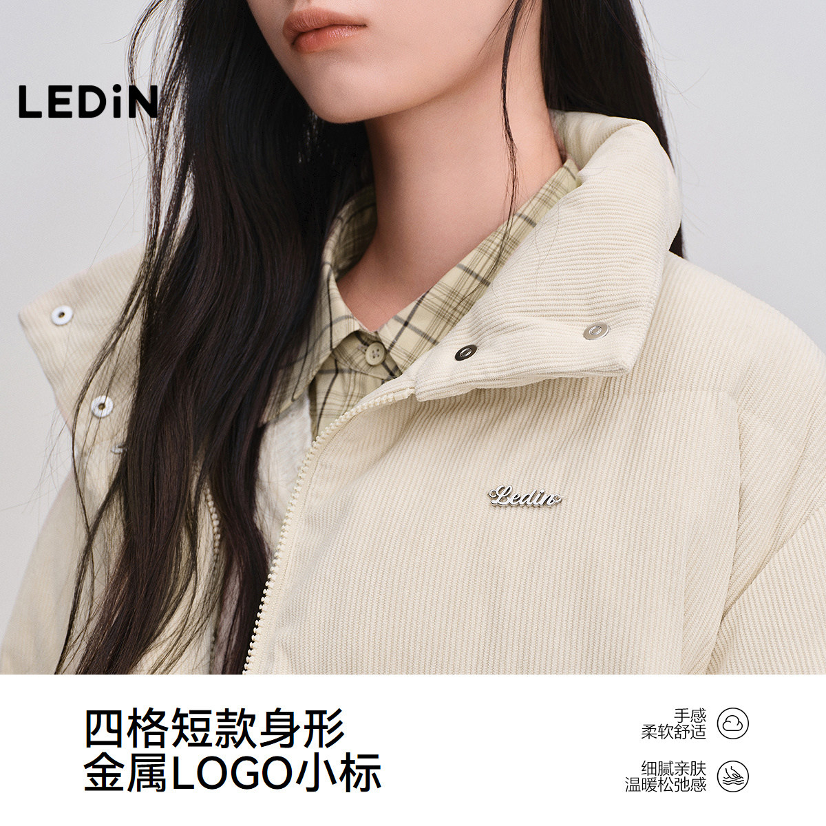 乐町灯芯绒面包羽绒服女装2025年冬季新款短款经典方格保暖外套