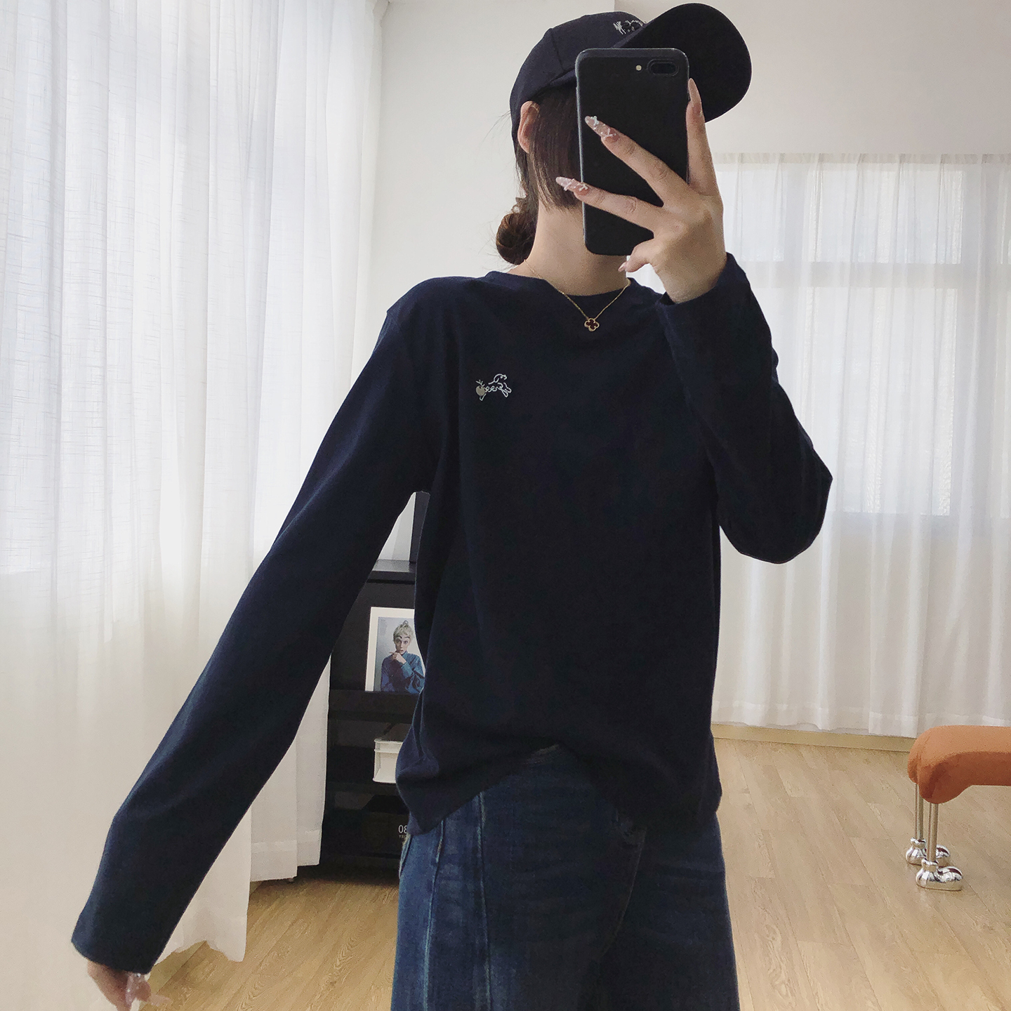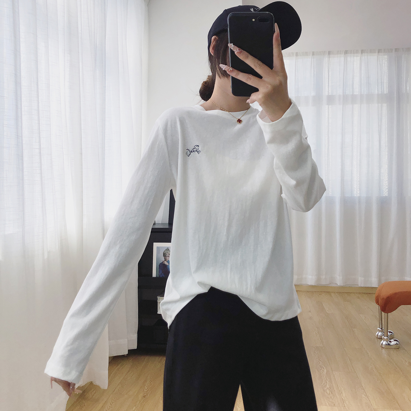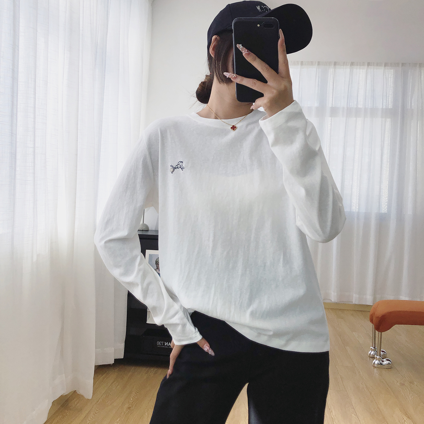 柔软小狗刺绣铁片装饰长袖T恤女秋季2025新款宽松显瘦休闲上衣秋