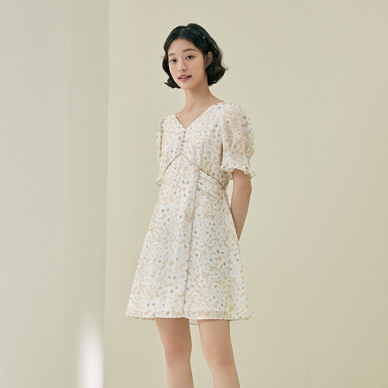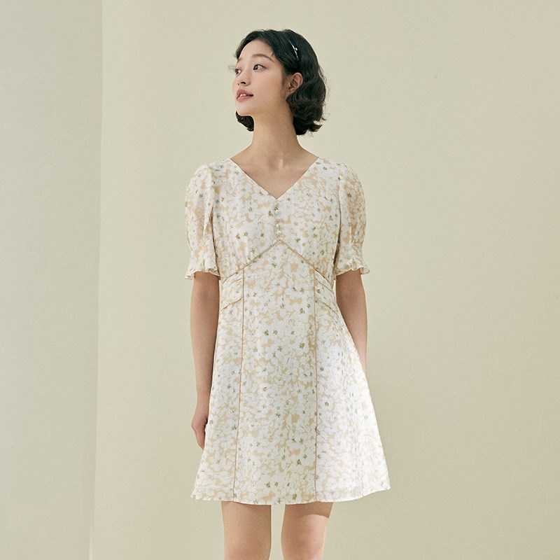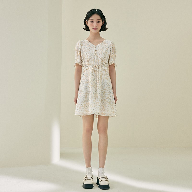 PIT法式复古V领收腰荷叶边短袖碎花半身裙女2025夏茶歇透气中长裙