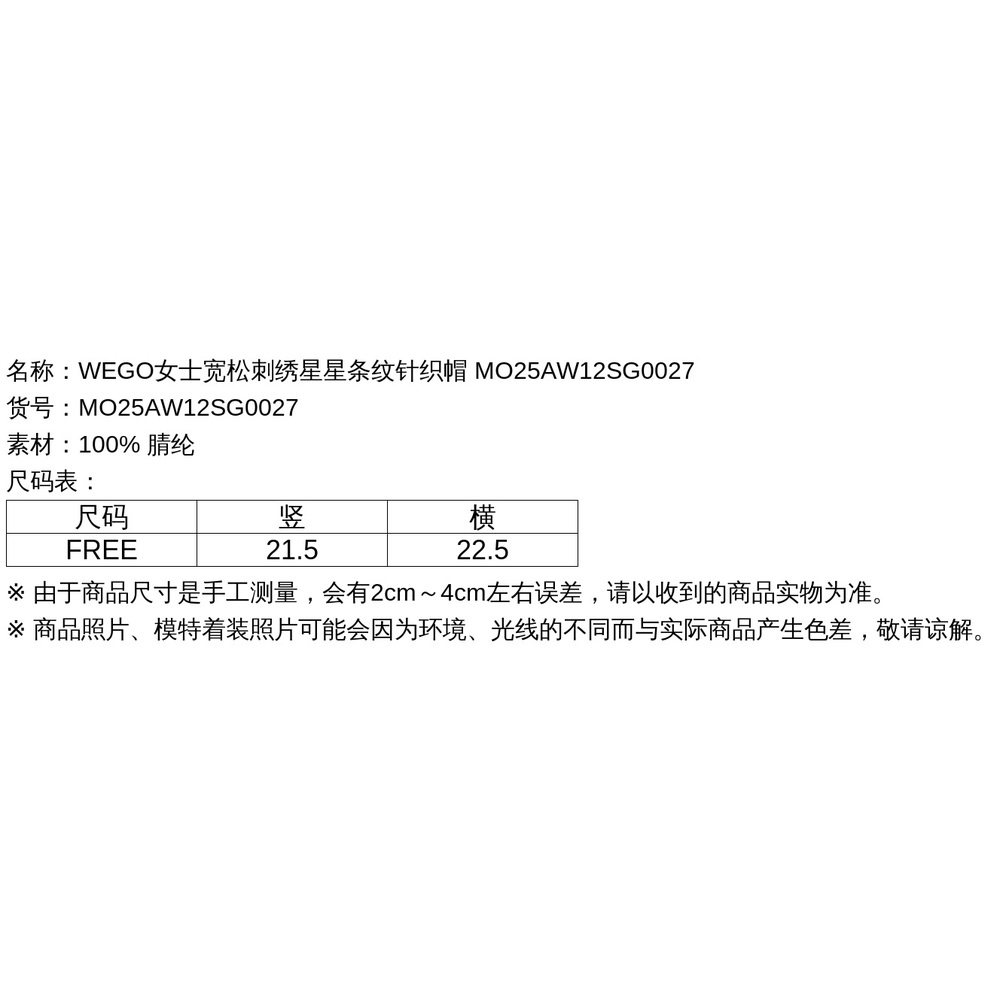 1h可退 日本直邮WEGO女士宽松刺绣星星条纹针织帽 MO25AW12SG0027