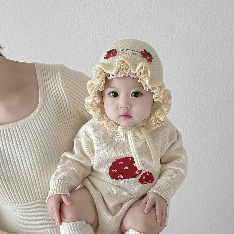 婴幼儿帽子秋冬季女宝宝蕾丝花边公主胎帽护耳针织保暖加厚毛线帽