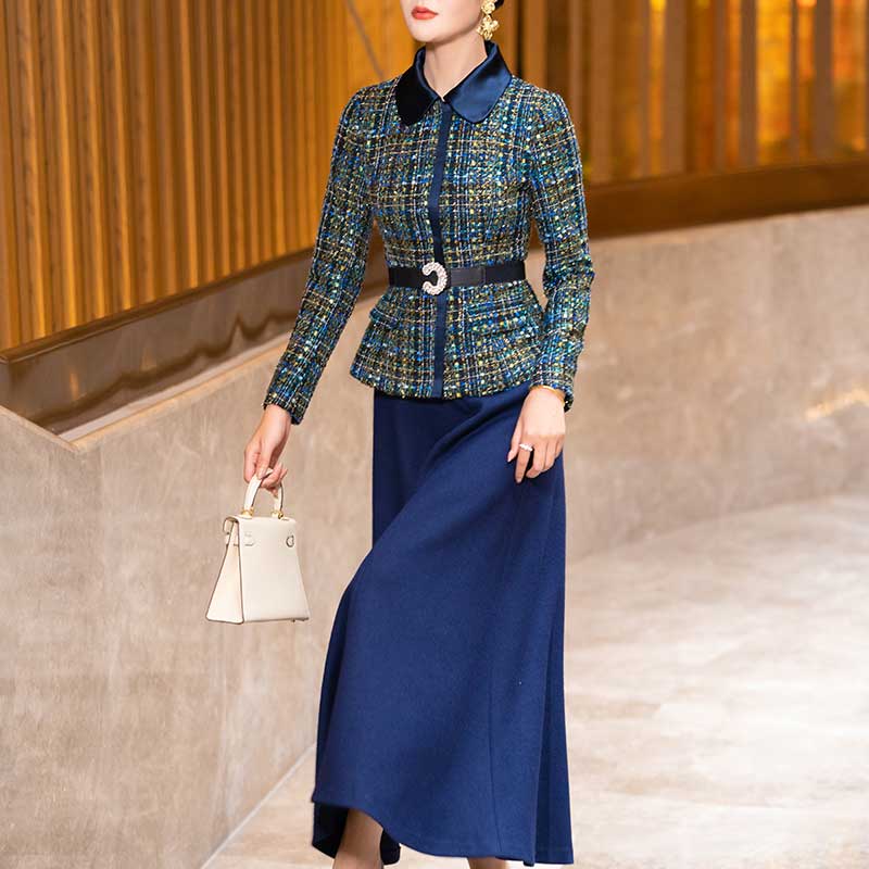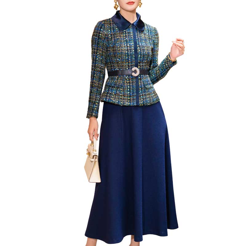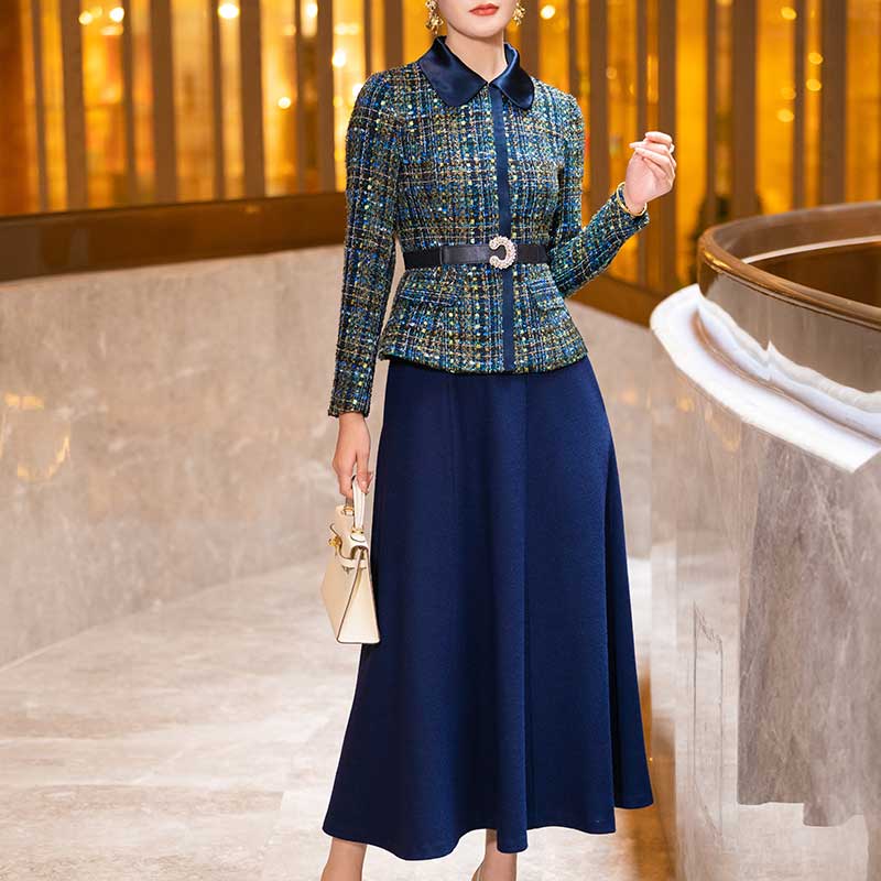 蓝色小香风套装裙女秋冬2025新款洋气气质修身显瘦长袖拼接两件套