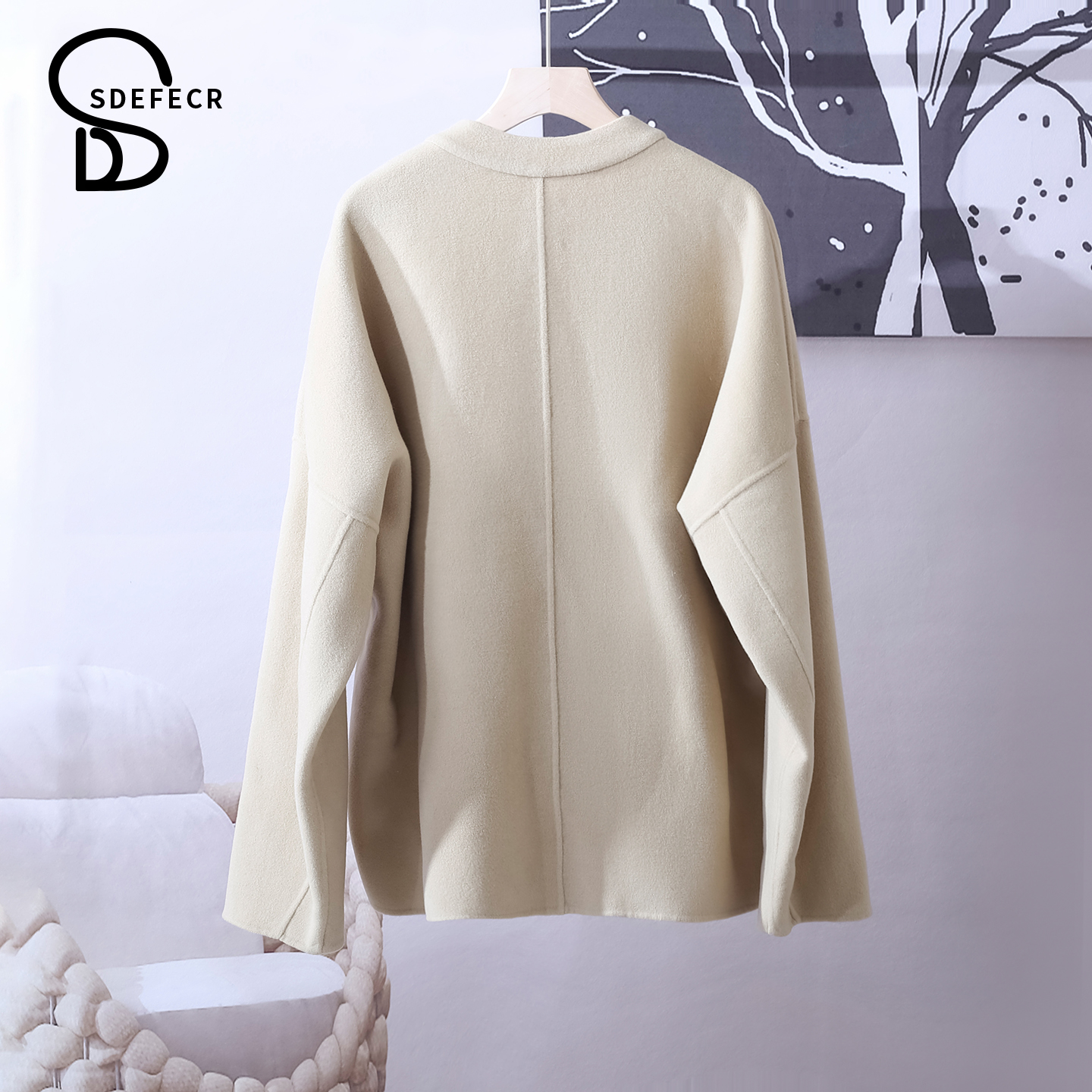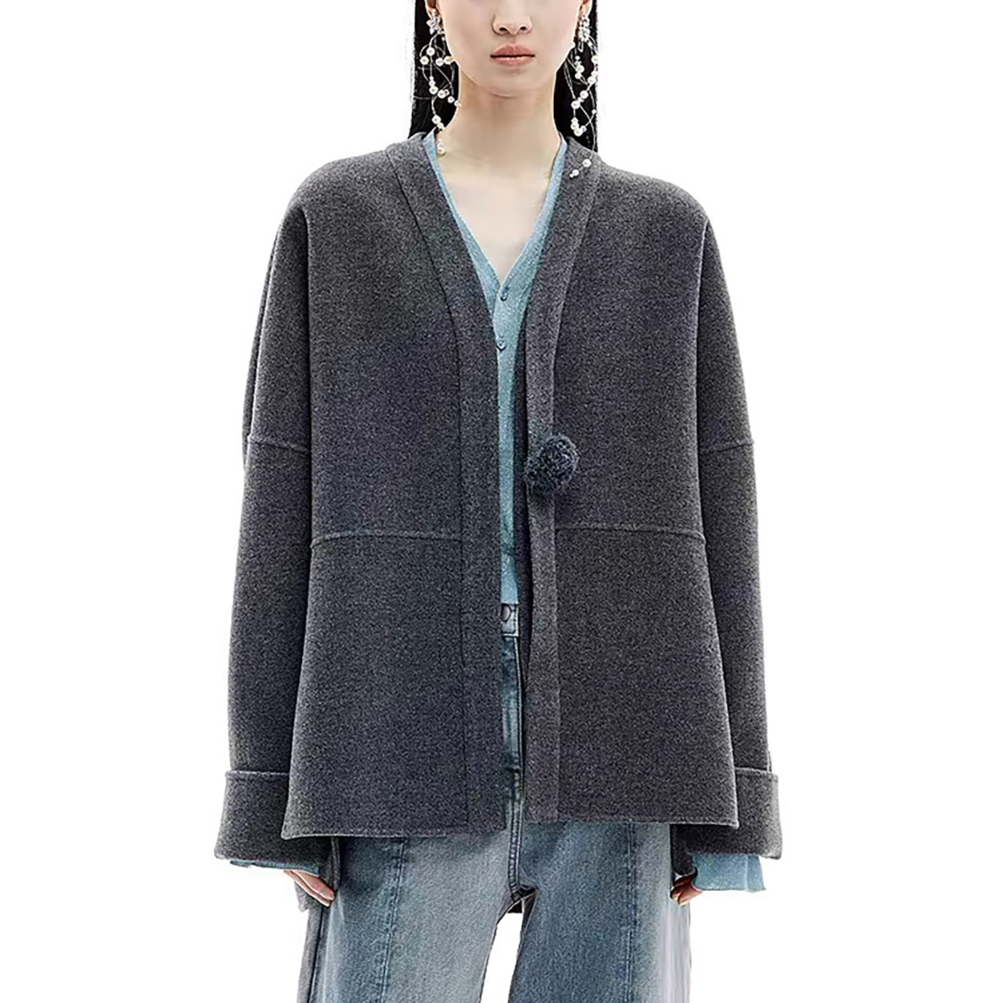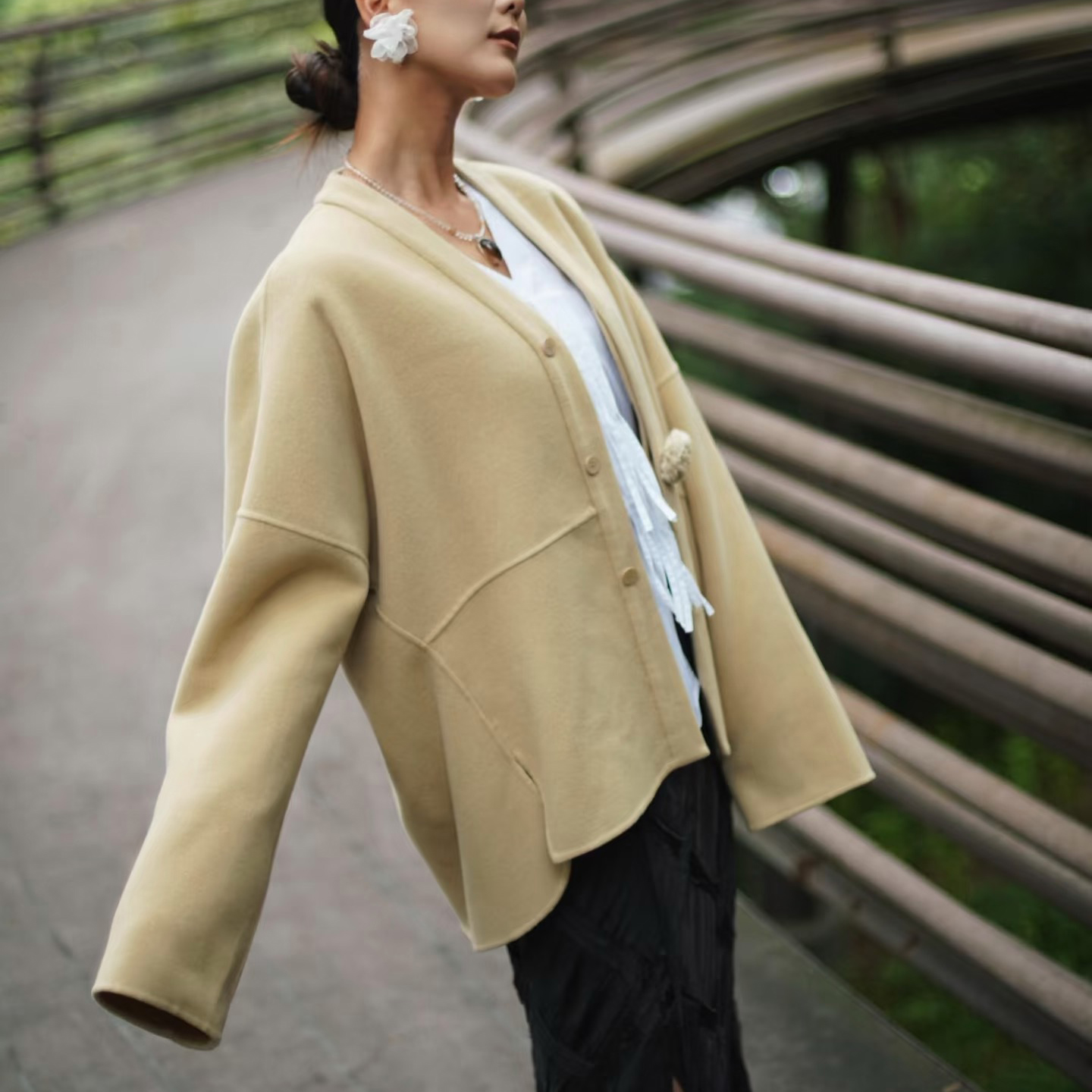 商场同款2025年秋冬新款时尚百搭V领拼接双面羊绒女大衣宽松外套