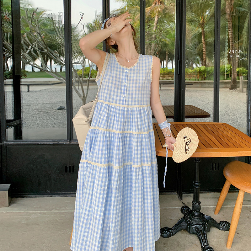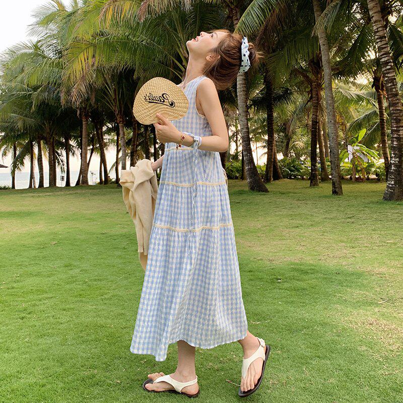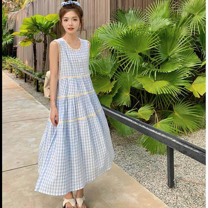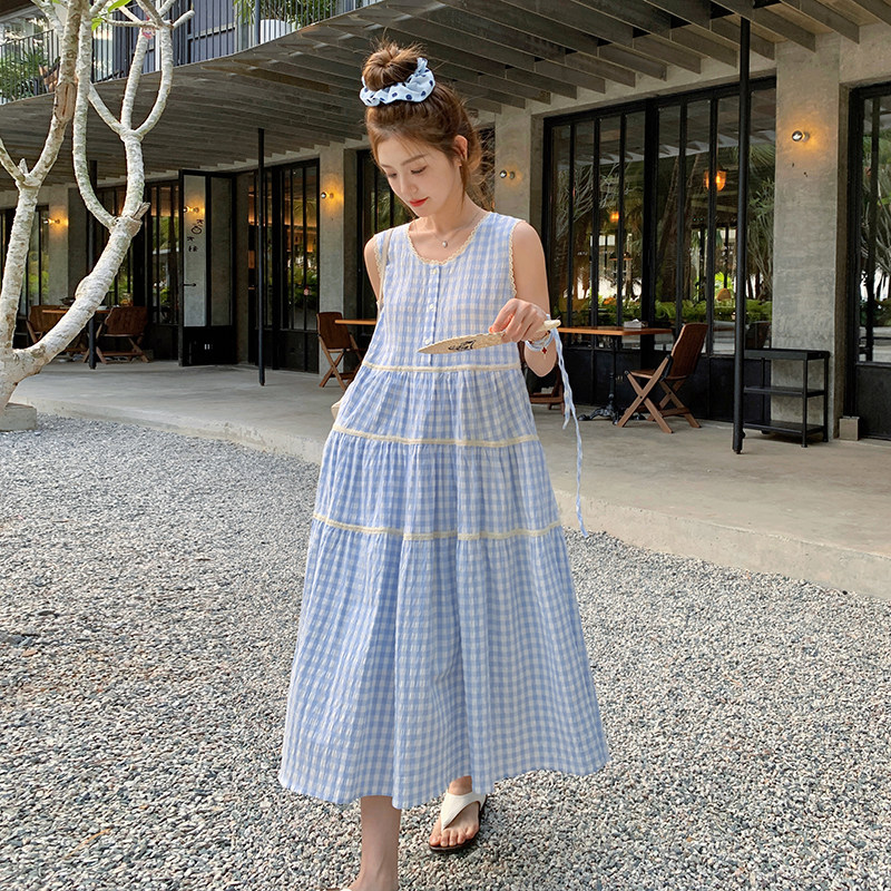 蓝白格子无袖背心连衣裙女夏季法式甜美宽松圆领森系小清新蛋糕裙