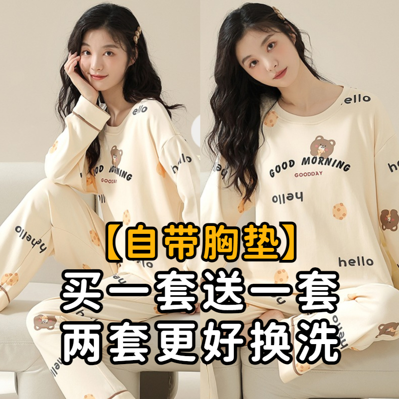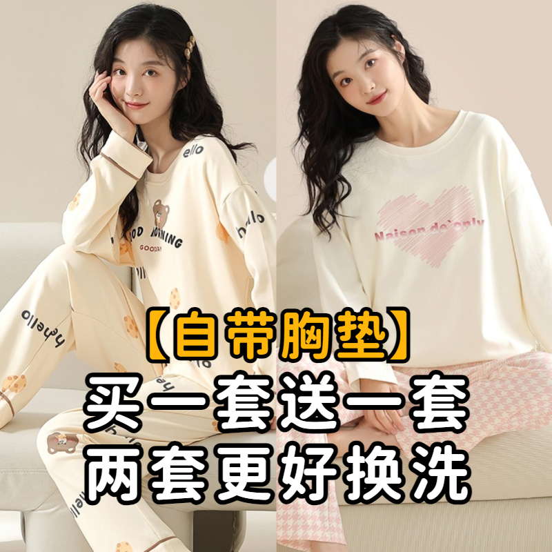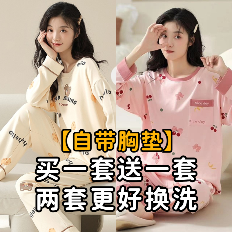 【买一送一】睡衣女春秋季长袖纯棉带胸垫高颜值家居服可外穿套装