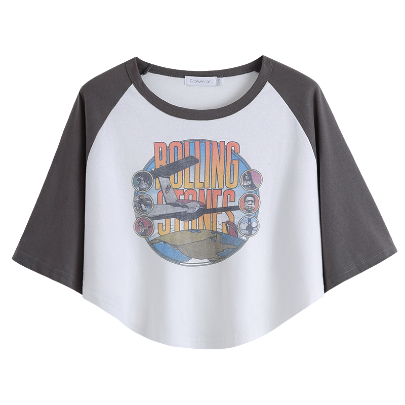 can美式复古撞色短袖T恤女夏宽松插肩袖短款百搭小众上衣
