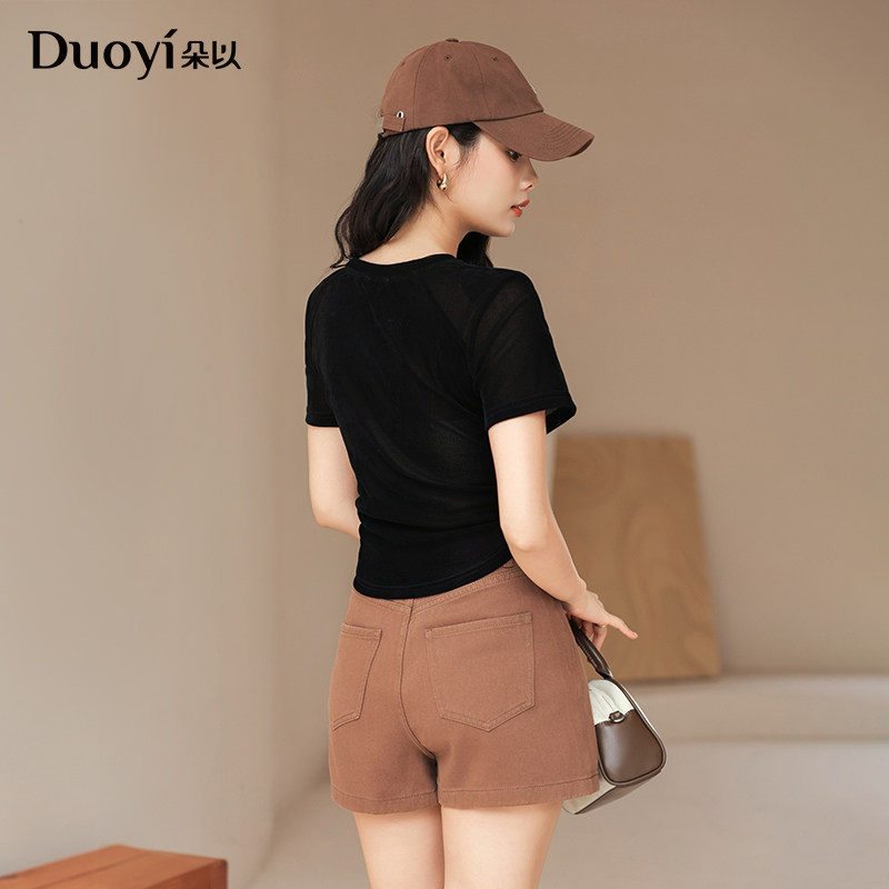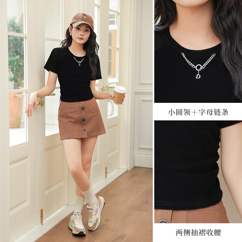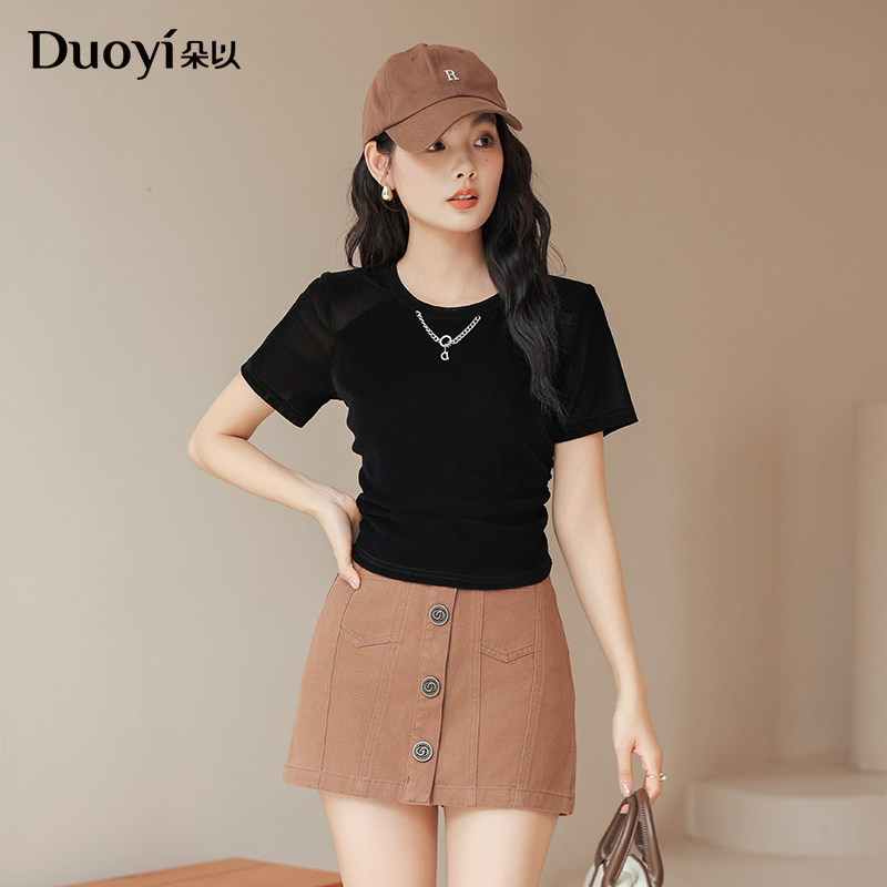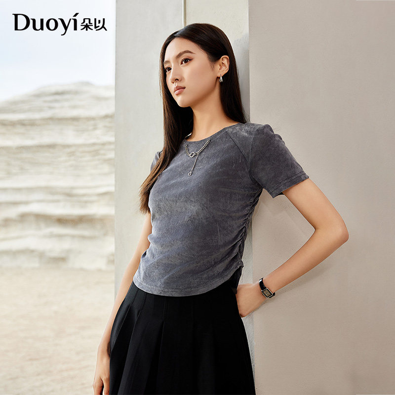 朵以2025秋季新款圆领褶皱收腰显瘦短款T恤小个子短袖39DQ349005