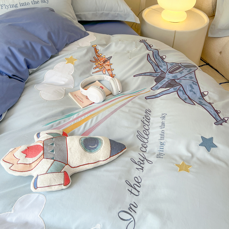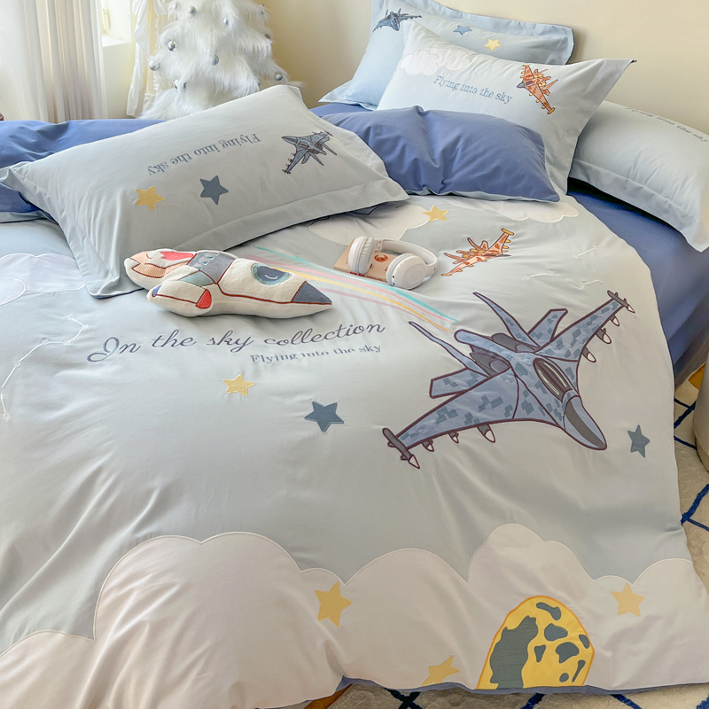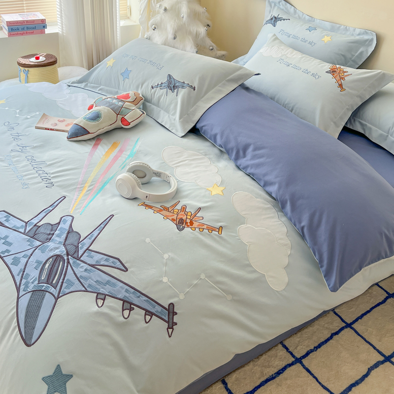 秋冬卡通飞机男孩全棉磨毛四件套儿童刺绣被套纯棉床单笠保暖床品