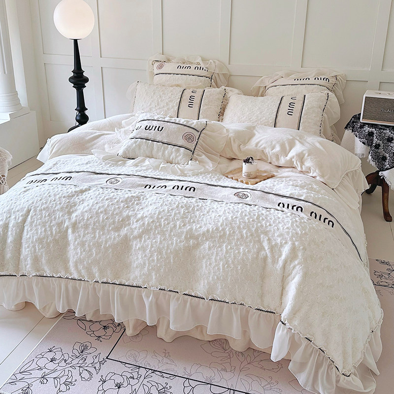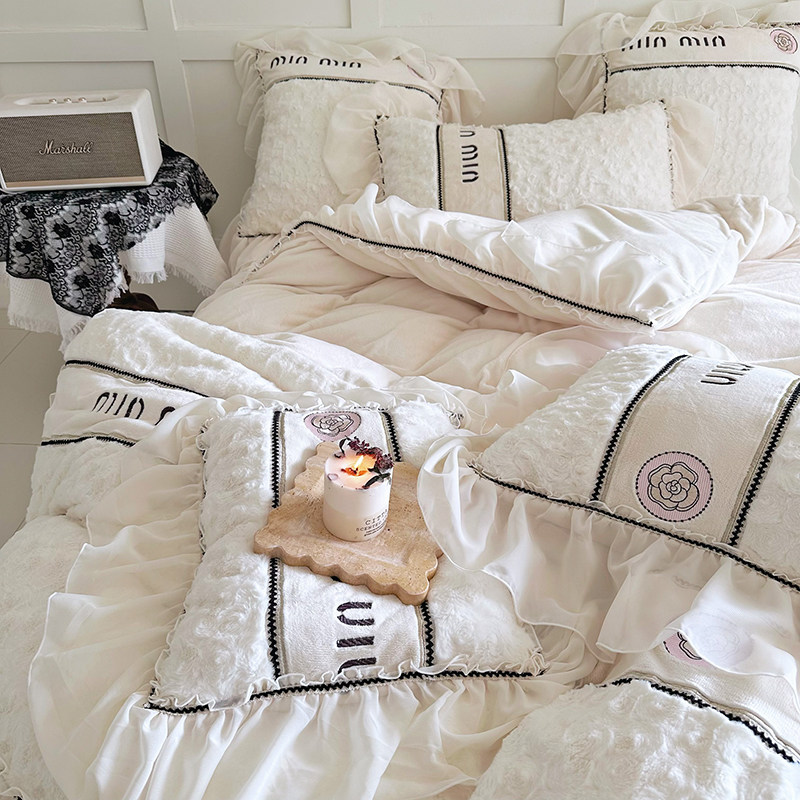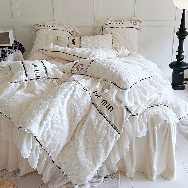 法式仙女牛奶绒四件套公主风蕾丝被套珊瑚绒白色高级感床裙款冬季