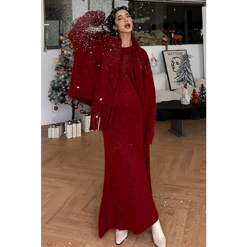 CIZZLEMORE 圣诞红色毛衣加厚套头针织衫+鱼尾裙秋冬搭配一整套装