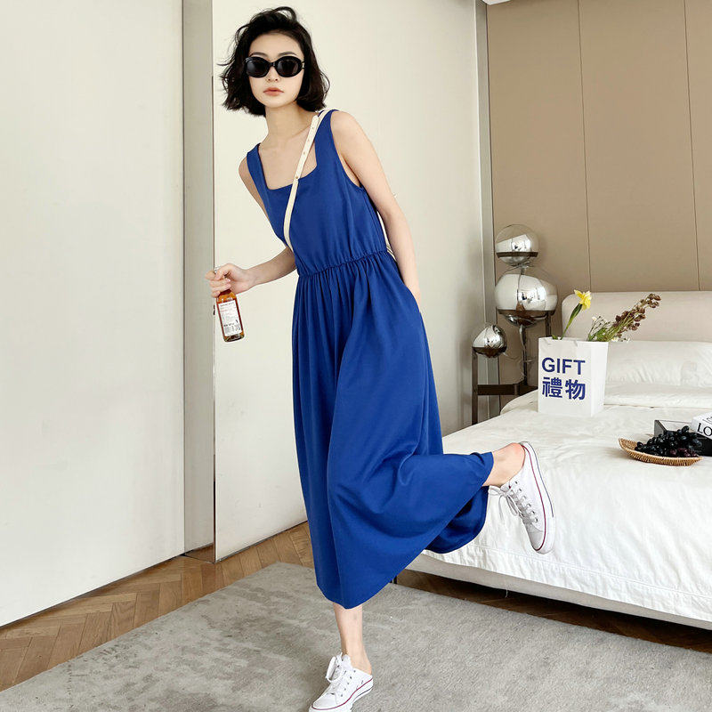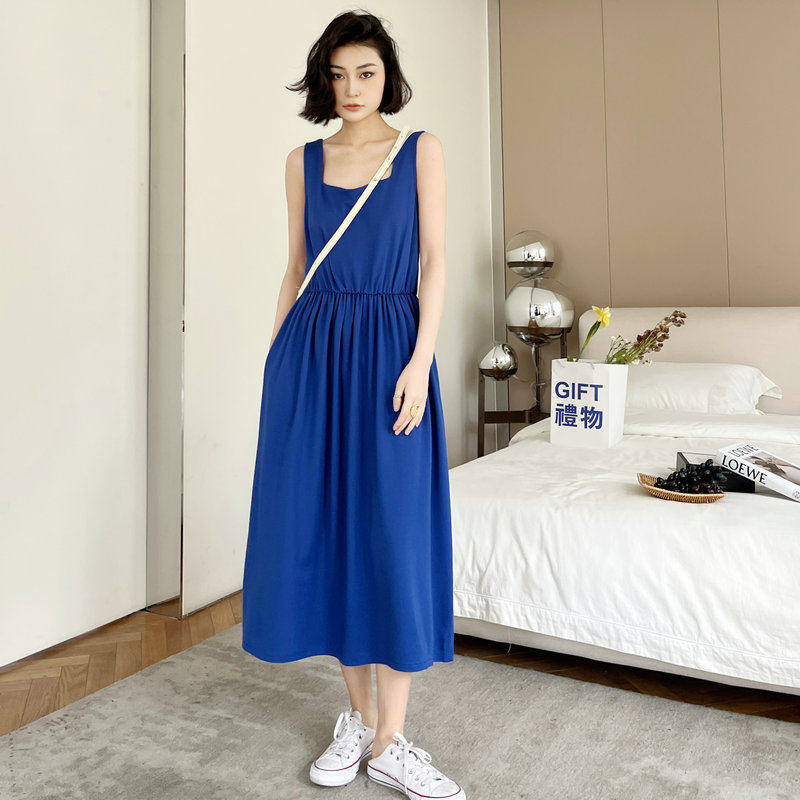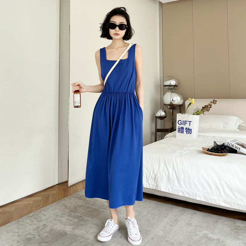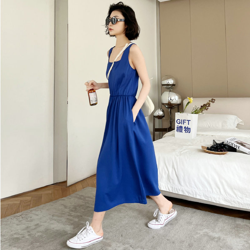 春夏宝蓝显白方领无袖口袋连衣裙背心长裙女收腰显瘦罗马棉度假裙