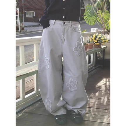 小众个性毛边花朵点缀水洗牛仔裤女2025冬季新款高腰显瘦阔腿长裤