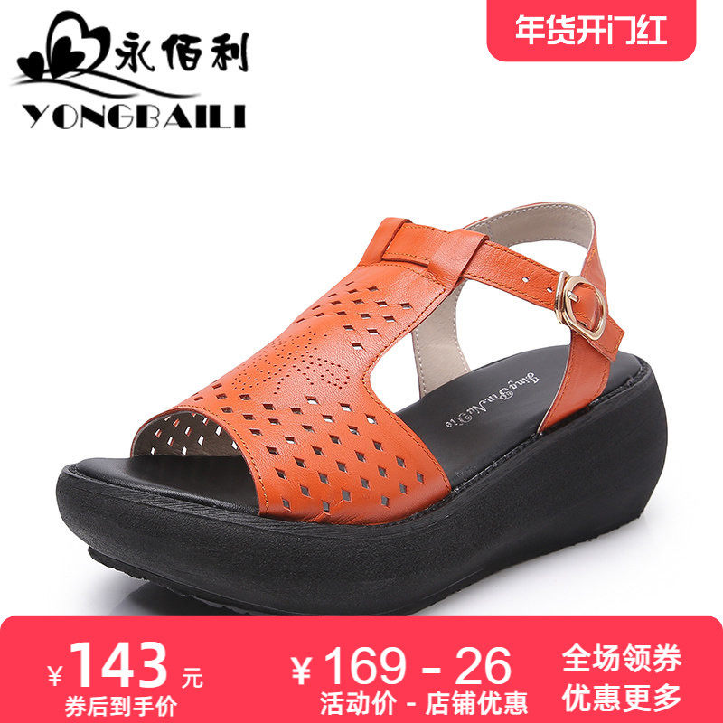 镂空真皮凉鞋休闲坡跟防水台厚底