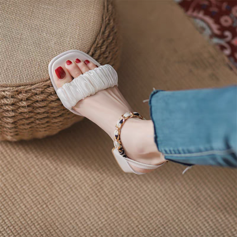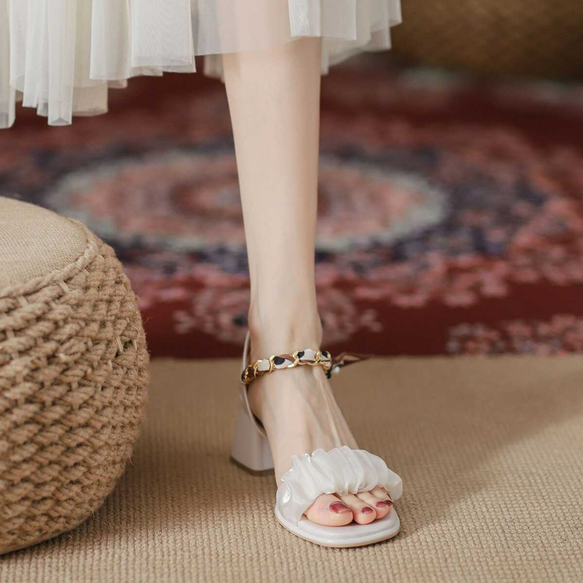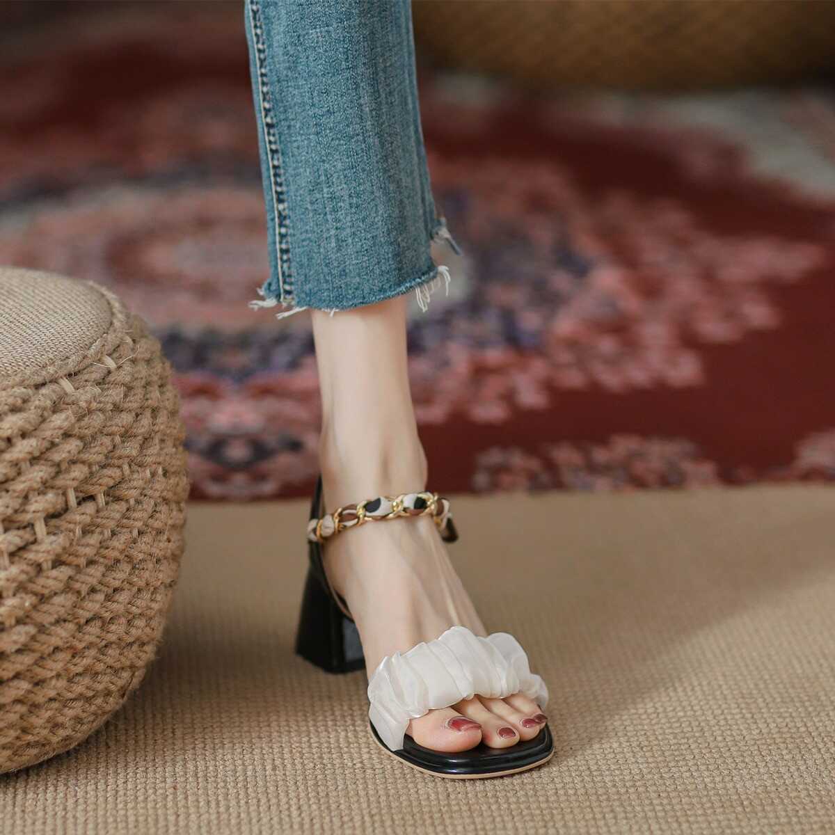 品牌断码鞋配裙子一字带粗跟凉鞋女2025夏季新款真皮仙女风高跟鞋