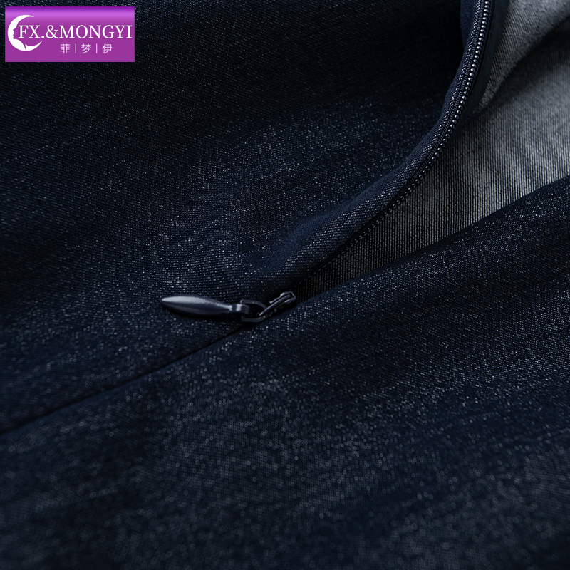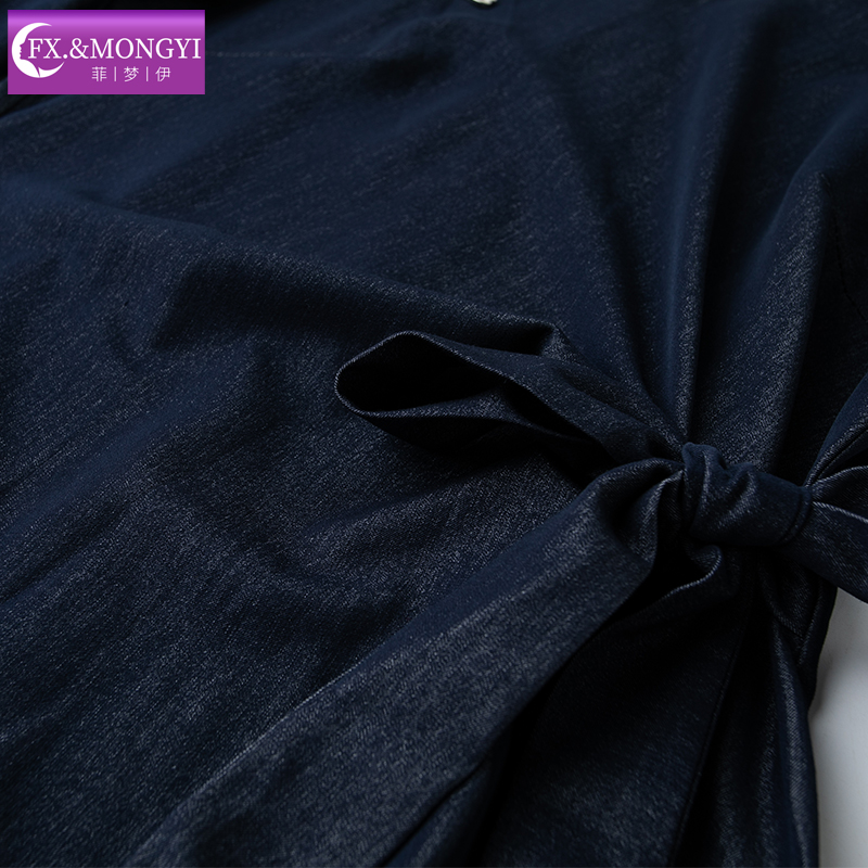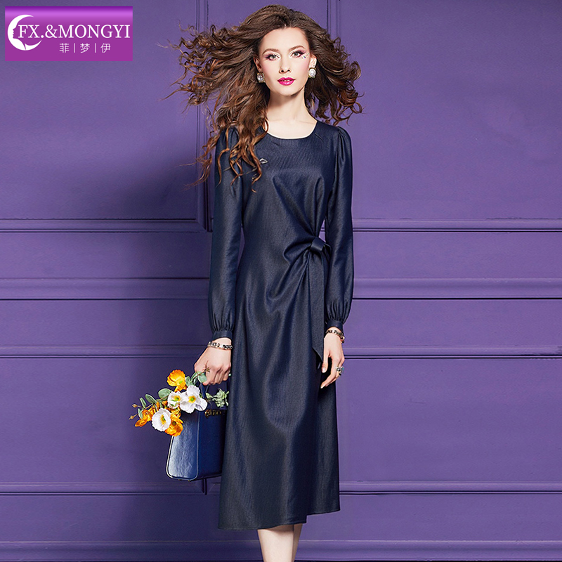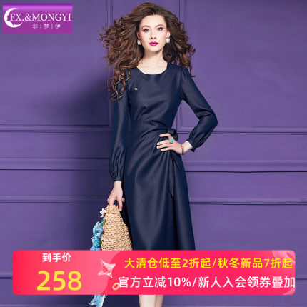 菲梦伊牛仔蓝连衣裙女长袖秋装复古高级褶皱设计感收腰气质礼服裙