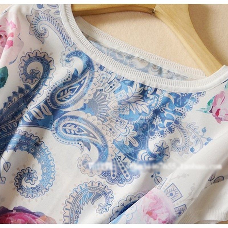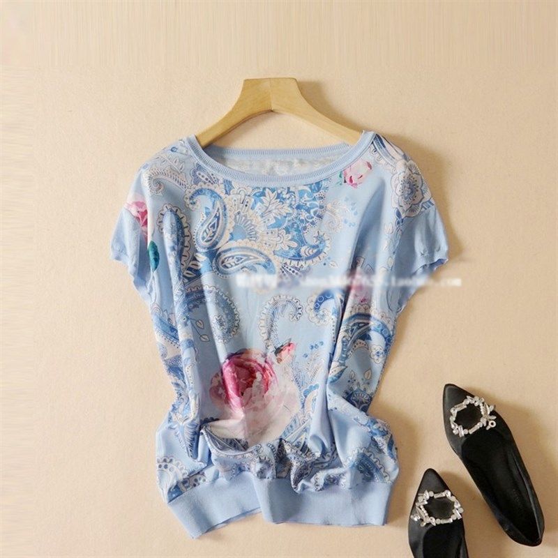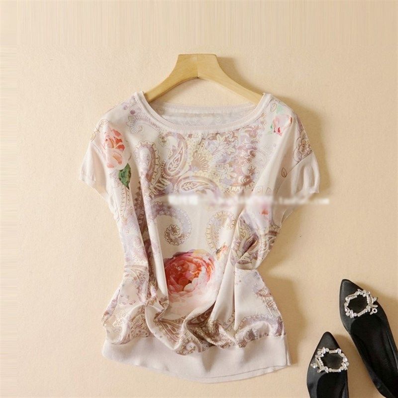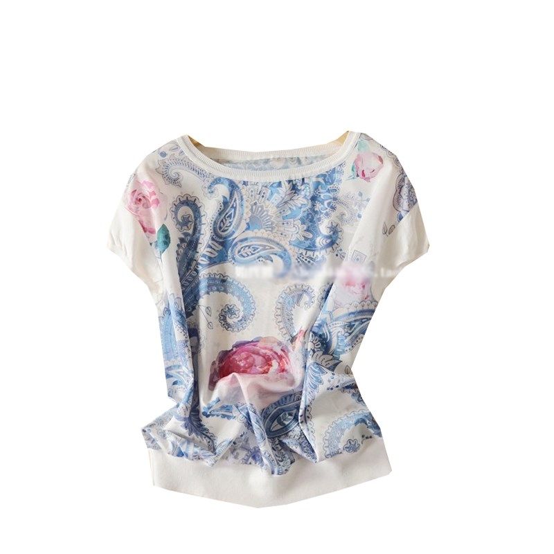 夏季穿舒适透气 洋气花卉雪纺印花拼针织衫薄款圆领短袖T恤上衣女