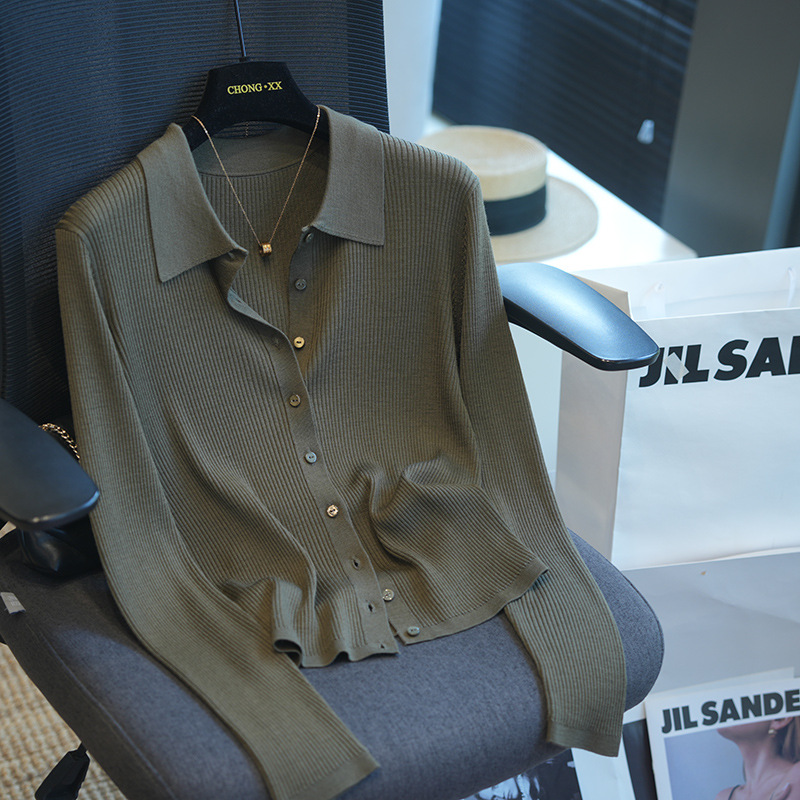 100绵羊毛经典polo领修身显瘦长袖针织开衫女上衣秋季新款