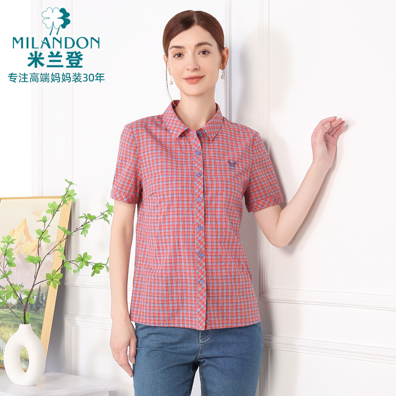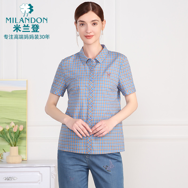 米兰登2025年中老年妈妈装夏季新款女装上衣纯棉显瘦短袖格子衬衫