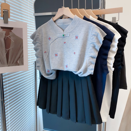 绣花旗袍领针织衫薄飞飞袖T恤潮