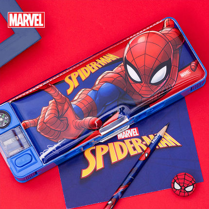 迪士尼文具盒男款塑料自动铅笔盒幼儿园儿童蜘蛛侠笔袋双层多功能男童小学生一年级男孩款高科技带削笔刀笔盒