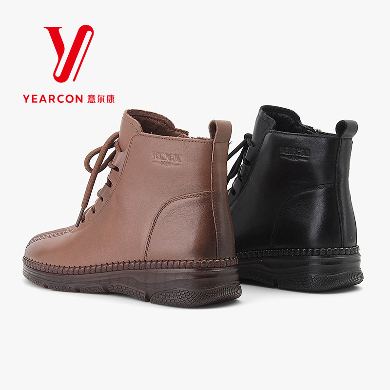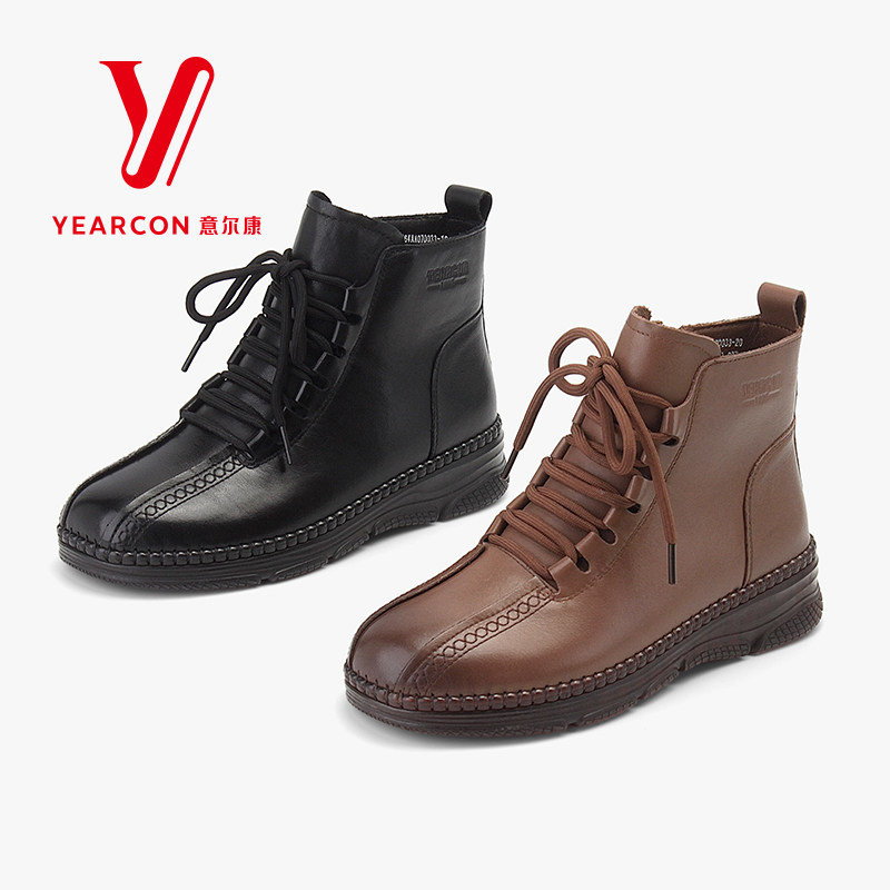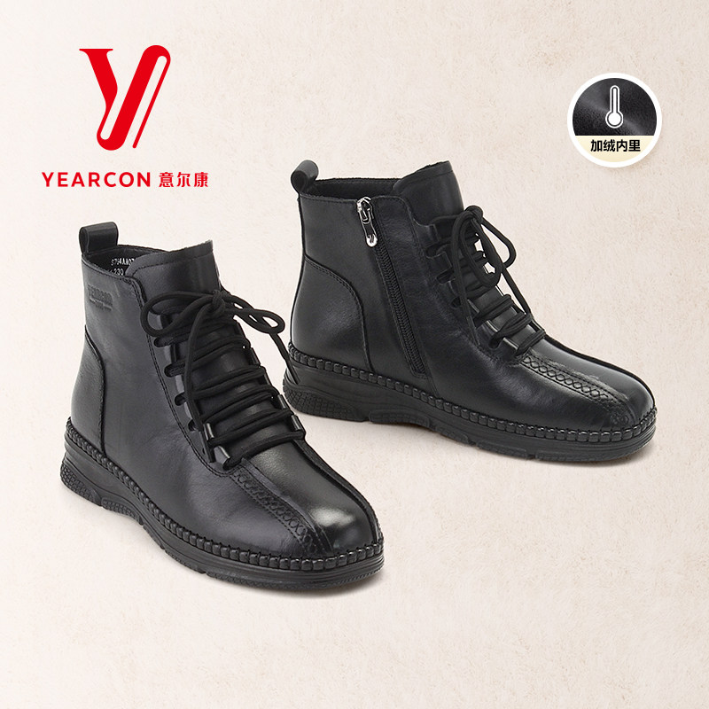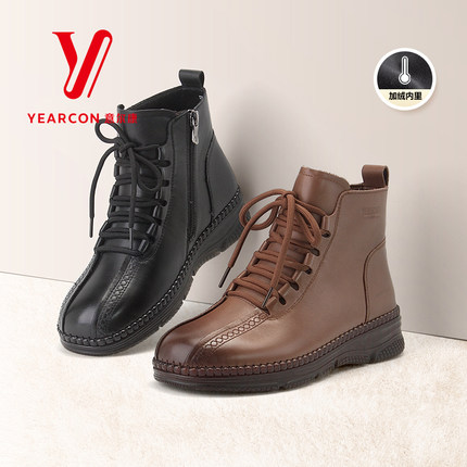 意尔康女靴2025冬季加绒真皮防滑妈妈棉鞋新款牛皮短靴舒适保暖靴