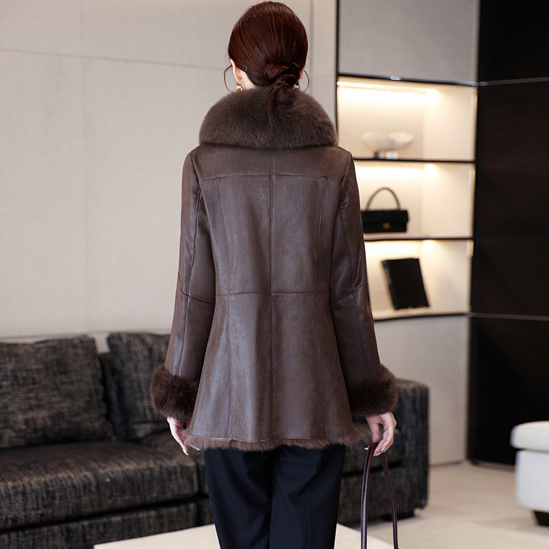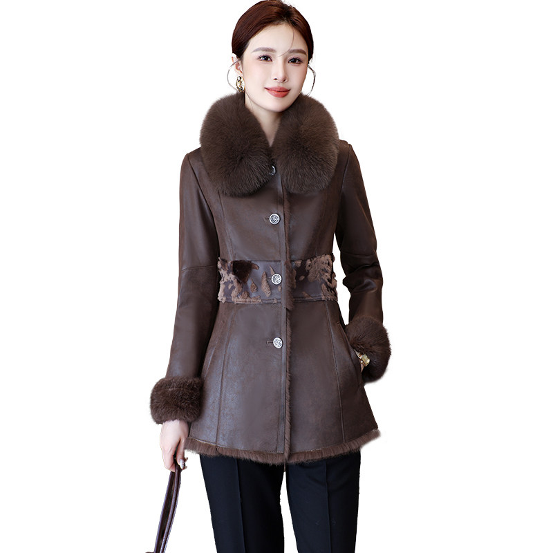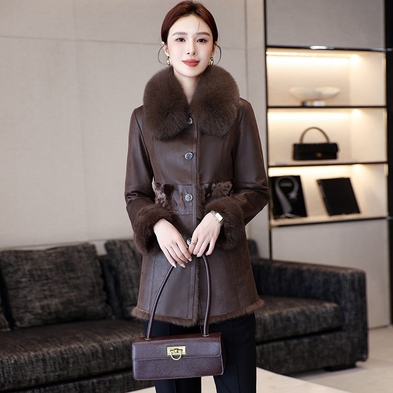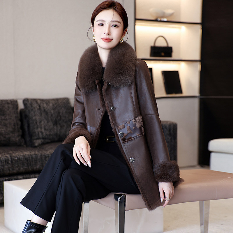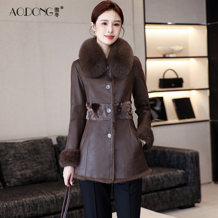 2024新款海宁兔毛皮草一体外套女修身狐狸毛领中长款保暖大衣冬季