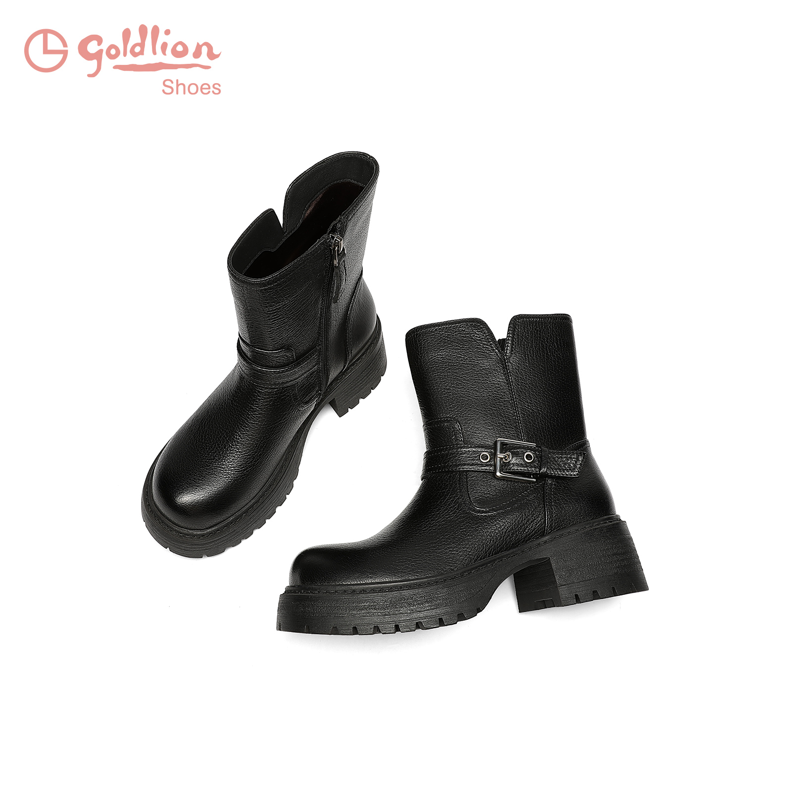 金利来女鞋2025新款英伦风厚底马丁靴女黑色皮带扣机车靴粗跟短靴