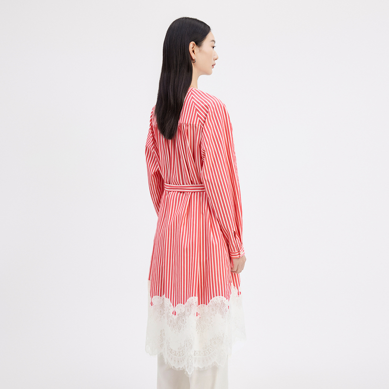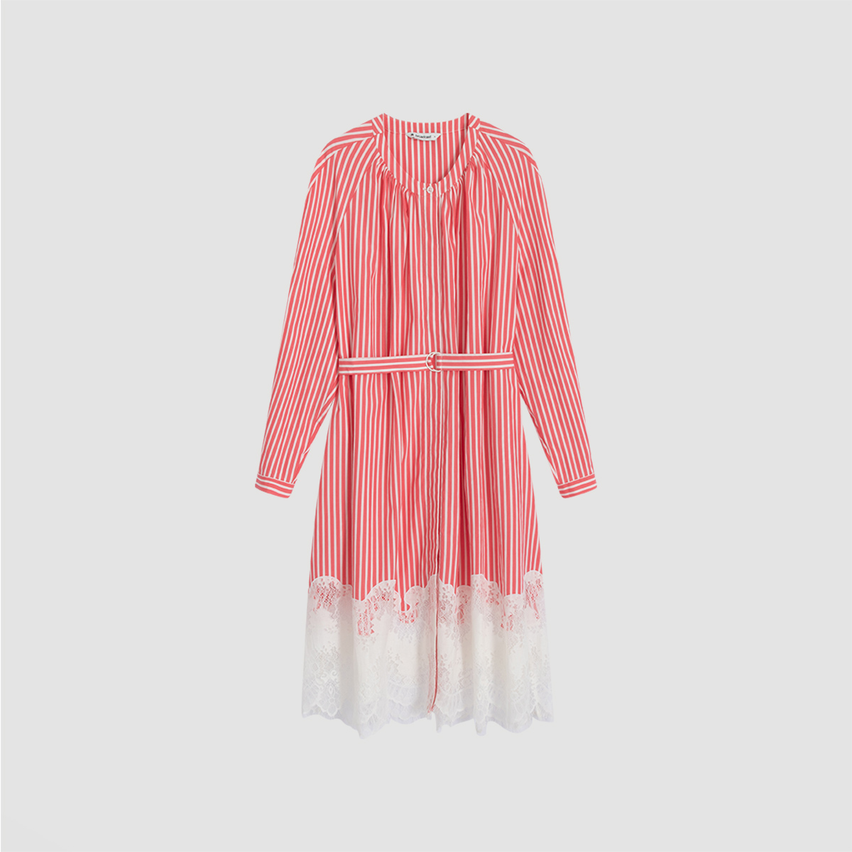 【播奥莱】播商场同款春季新款活跃条纹拼接唯美蕾丝连衣裙