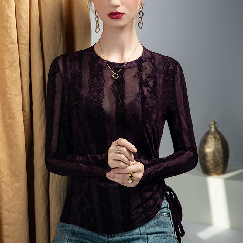 圆领蕾丝打底衫女2025秋季新款复古印花洋气小衫网纱拼接系带上衣